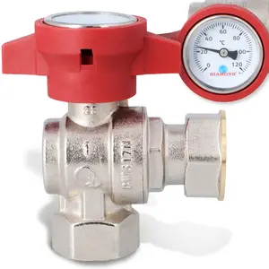 Zawór kulowy kątowy motylkowy z dławikiem, termometrem 10 bar i półśrubunkiem 1'' GW x 1'' GW niebieski