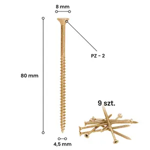Wkręty do drewna z łbem stożkowym i gniazdem PZ 4,5 x 80 w blistrze 9 sztuk