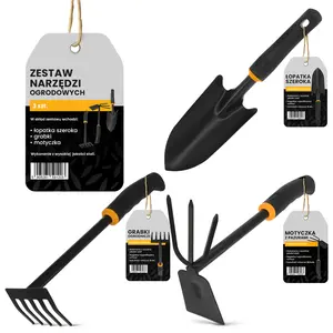 - Skład zestawu:Łopatka wąska, łopatka szeroka, grabki, motyczka