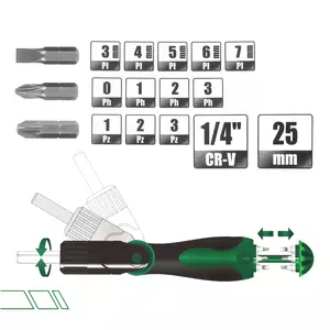 - Dodatkowe właściwości:Schowek na bity w rękojeści