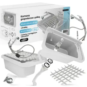 Komora gospodarcza z półką 50 cm x 34 cm x 21 cm i kratką 36 cm x 30 cm biały i baterią z wyciąganym natryskiem