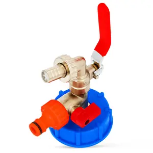 Zawór czerpalny podwójny z dławikiem 1/2'' GZ x 3/4'' GZ x 3/4'' GZ z przyłączem na wąż 3/4'' GZ x 1/2'' W, przyłączem pod szykozłączke 3/4'' GW x 1/2'' SZ i złączem IBC S60x6 2'' GW x 1/2" GW