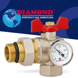 Zawór kulowy kątowy motylkowy z dławikiem, termometrem 10 bar 1'' GW x 1 1/4'' GZ i śrubunkiem 1 1/4'' GW x 1'' GZ niebieski