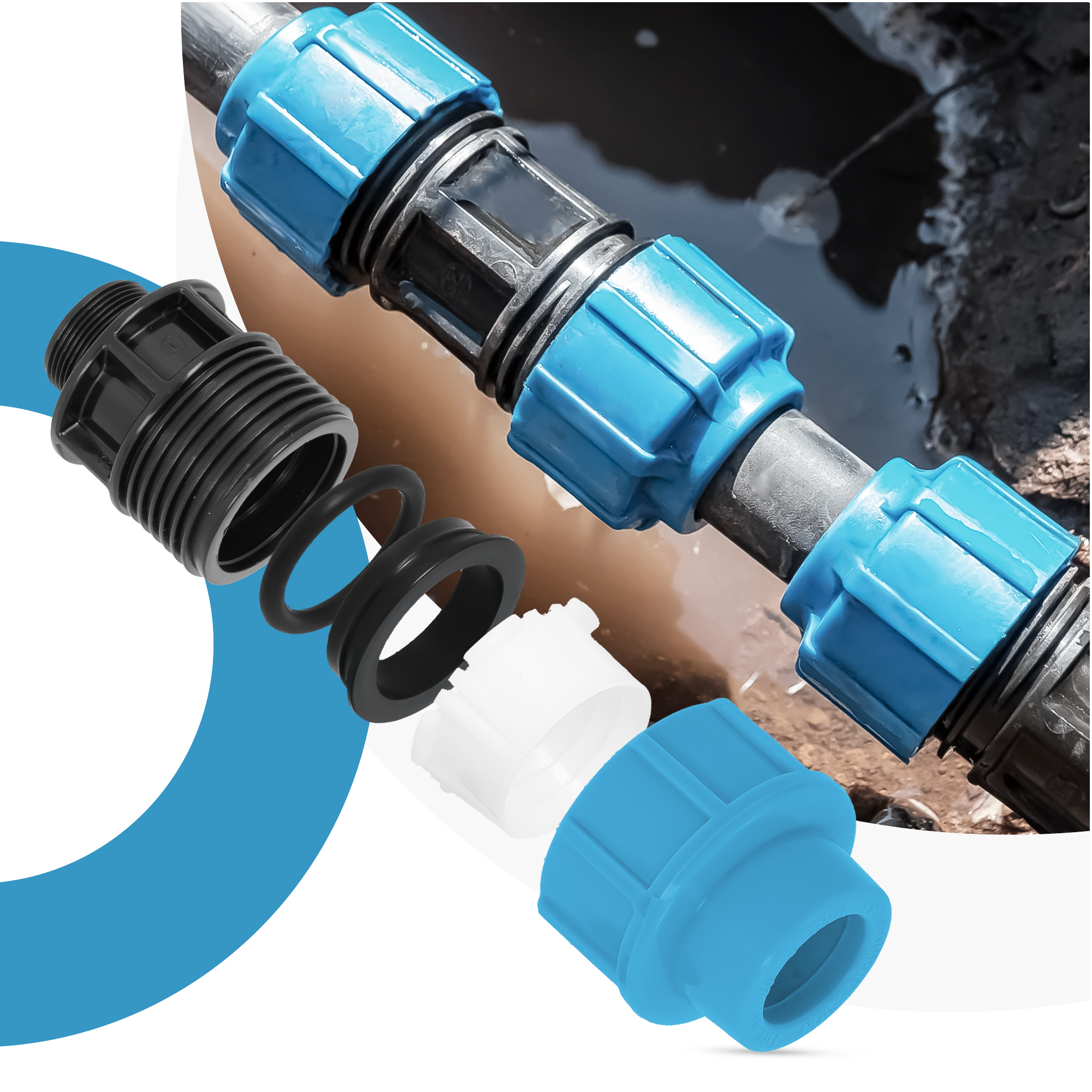 Skręcana konstrukcja elementu sprawia, że jego montaż jest wyjątkowo łatwy. Zaletą złączek PE jest ich poręczny kształt i niewielka waga. Dzięki temu instalacja jest bezproblemowa i nie wymaga użycia specjalistycznych narzędzi. Wystarczy zacisnąć pierścień na rurze, aby uzyskać szczelne połączenie.