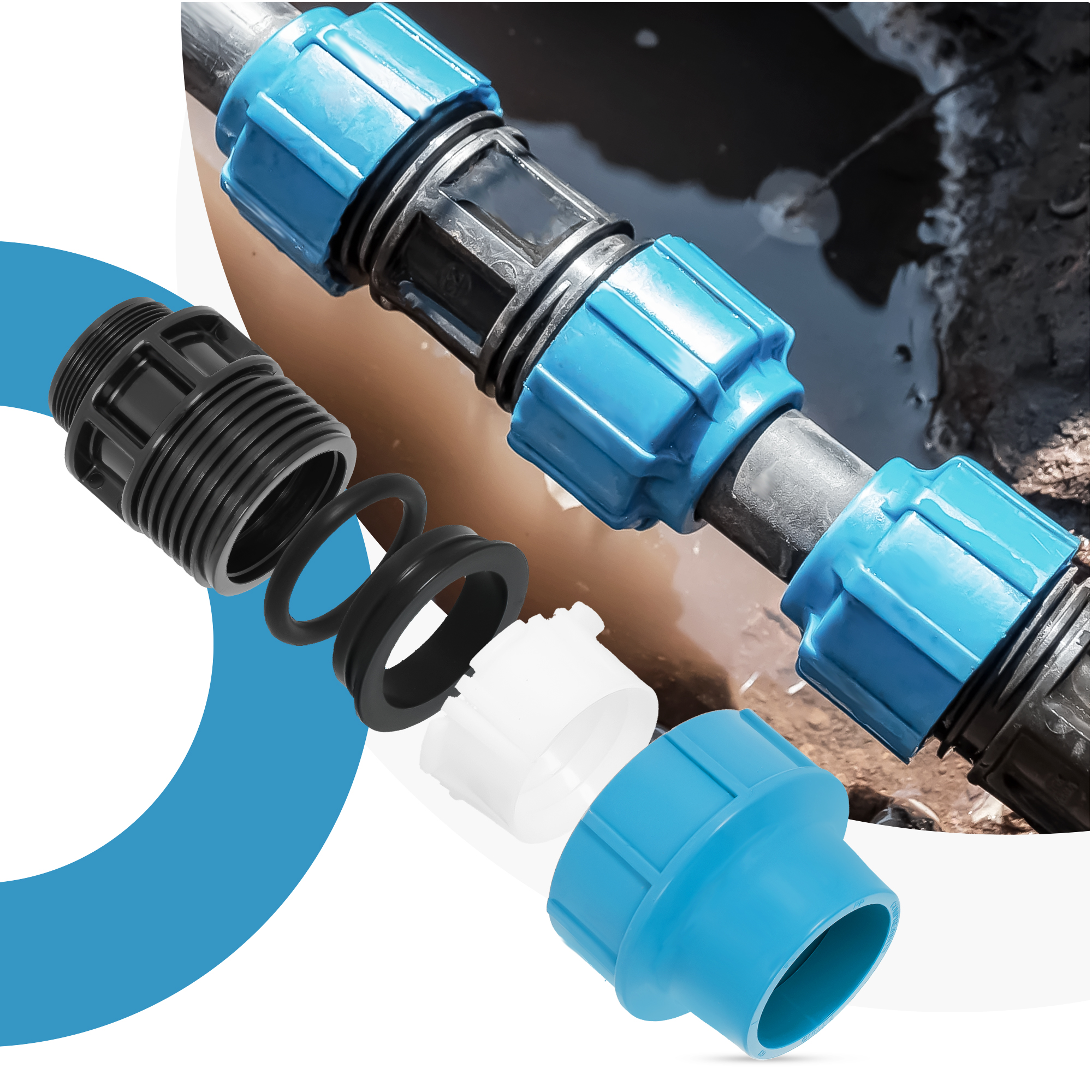 Skręcana konstrukcja elementu sprawia, że jego montaż jest wyjątkowo łatwy. Zaletą złączek PE jest ich poręczny kształt i niewielka waga. Dzięki temu instalacja jest bezproblemowa i nie wymaga użycia specjalistycznych narzędzi. Wystarczy zacisnąć pierścień na rurze, aby uzyskać szczelne połączenie.