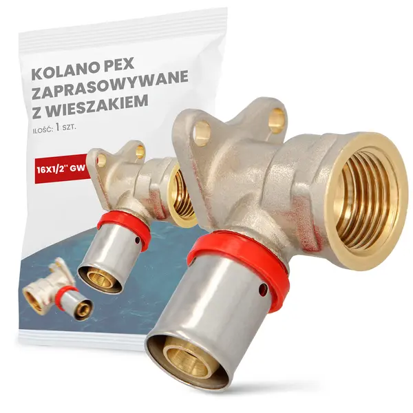 Potrzebujesz dostosować system rurociągu do układu pomieszczenia? Oprócz zwykłych złączek przyda Ci się także kolano zaprasowywane PEX z wieszakiem. Dzięki niemu przymocujesz element do ściany i uzyskasz praktyczne połączenie.