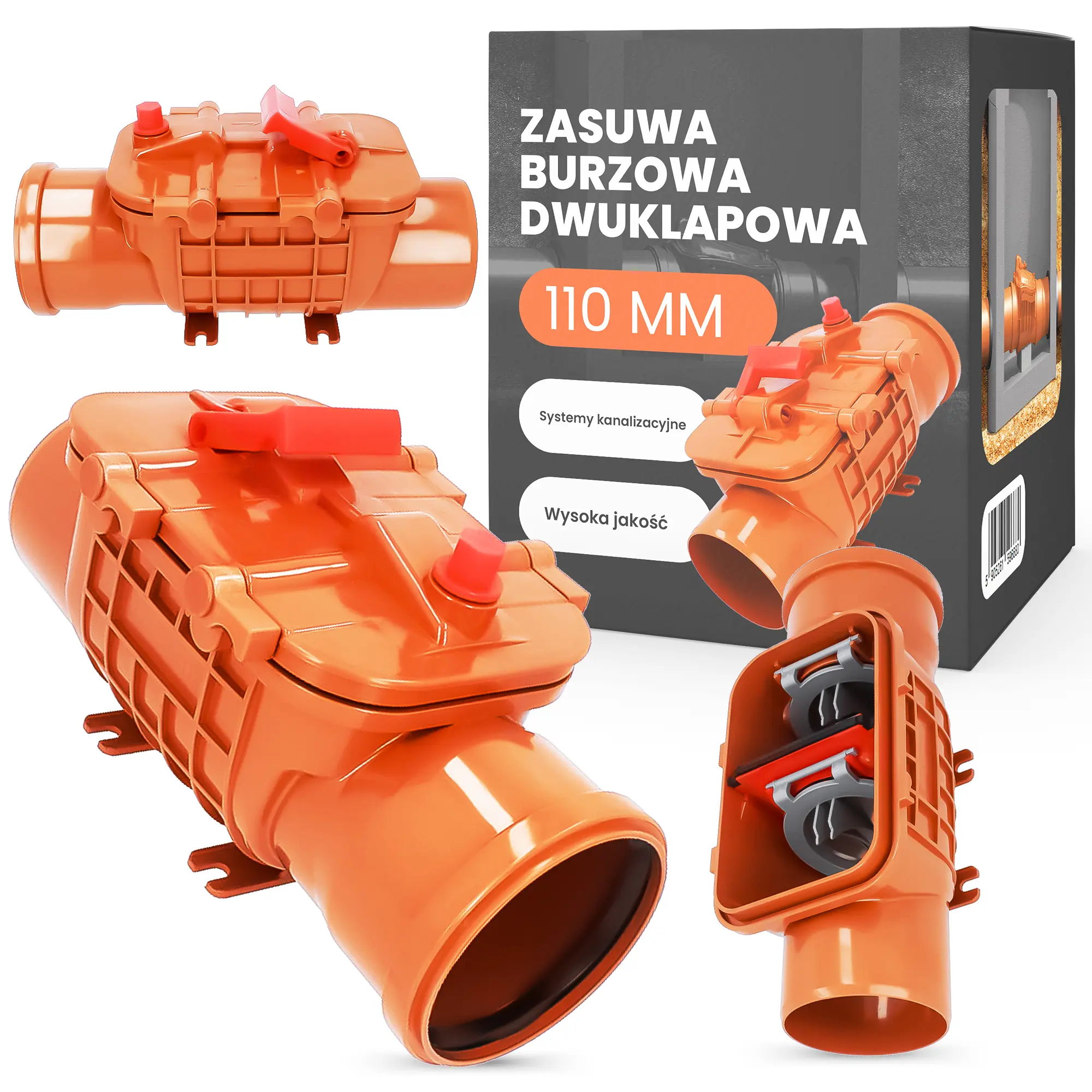 Zawór zwrotny dwuklapowy odpływu kanalizacji chroni dom przed zalaniem w wyniku cofania się ścieków kanalizacyjnych. Produkt wykonano z tworzywa sztucznego - ABS, które zapewnia wysoką odporność na działanie wilgoci i uszkodzenia mechaniczne. Zawór nie ulega także korozji.