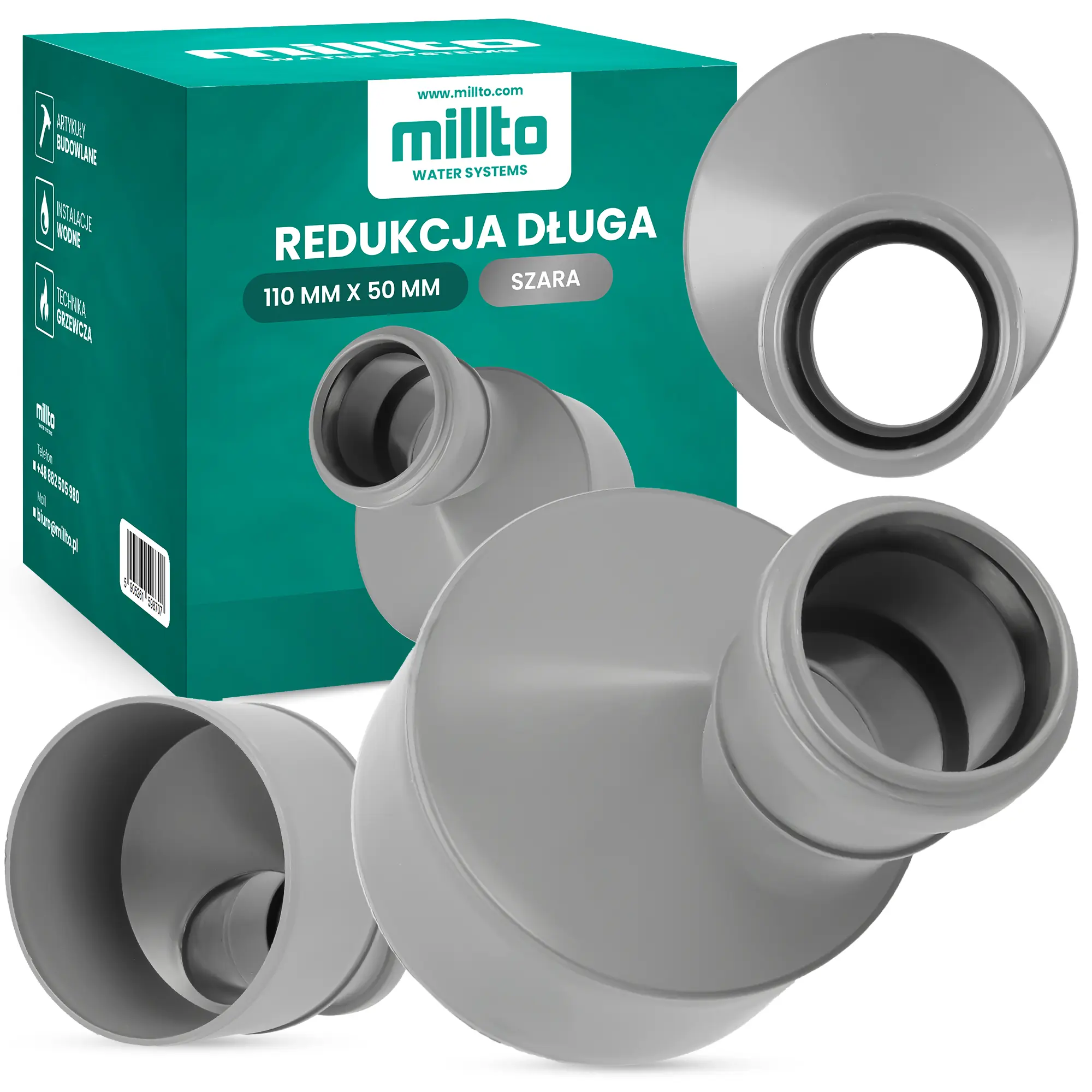 Element jest mocny i zawiera wewnętrzną uszczelkę. Dzięki temu uzyskane połączenie jest trwałe i odporne na przeciekanie. Redukcja jest uniwersalna, dlatego sprawdzi się w przypadku różnego rodzaju rur i przewodów stosowanych w kanalizacji.