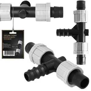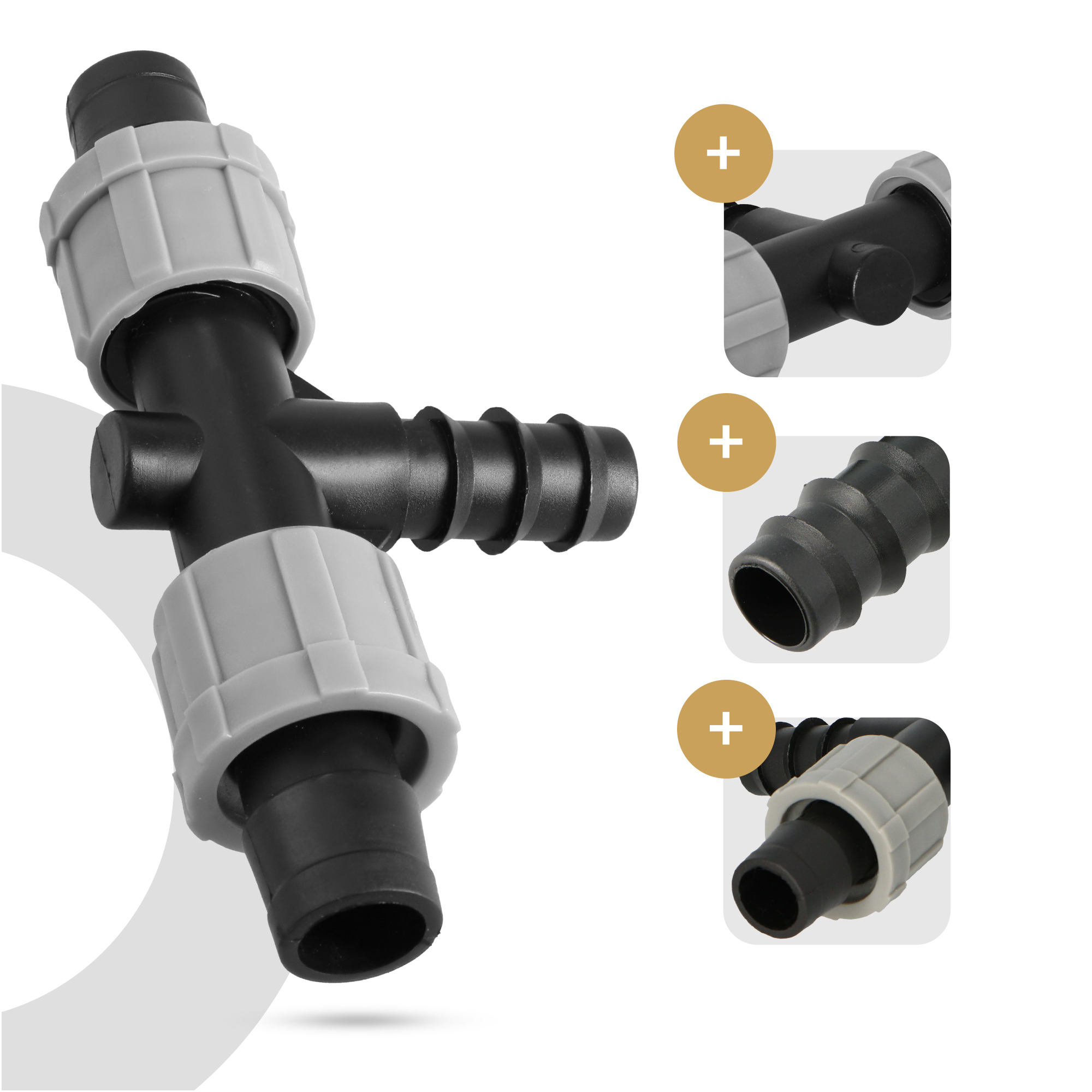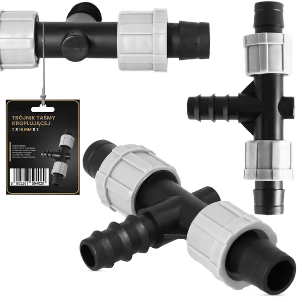 Element został zaprojektowany specjalnie do taśm kroplujących. To zapewnia dokładne dopasowanie, a uzyskane połączenie jest odporne na przeciekanie. Skręcane nakładki na gwincie zapobiegają wyślizgiwaniu się przewodów. Dzięki temu system działa bez zarzutu.