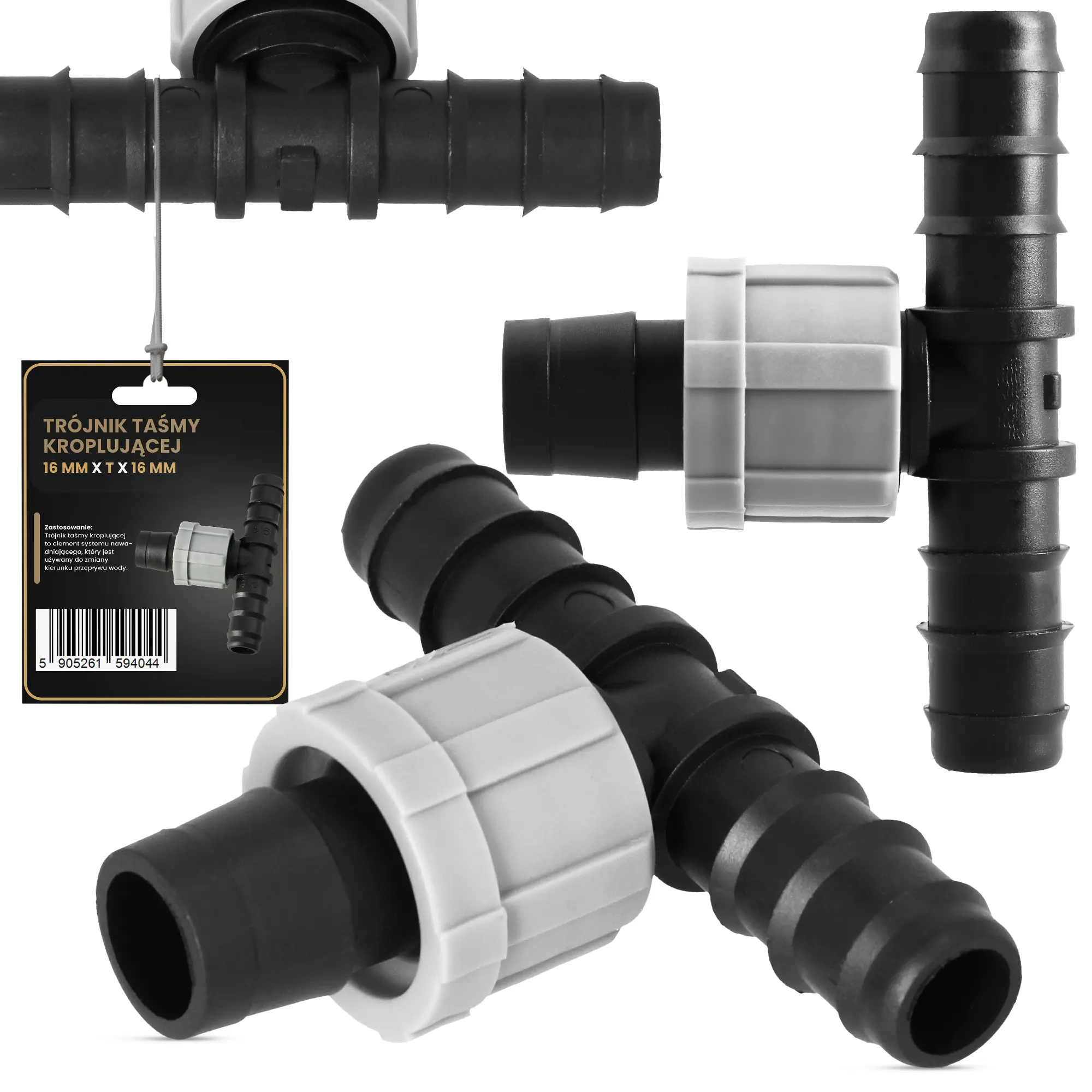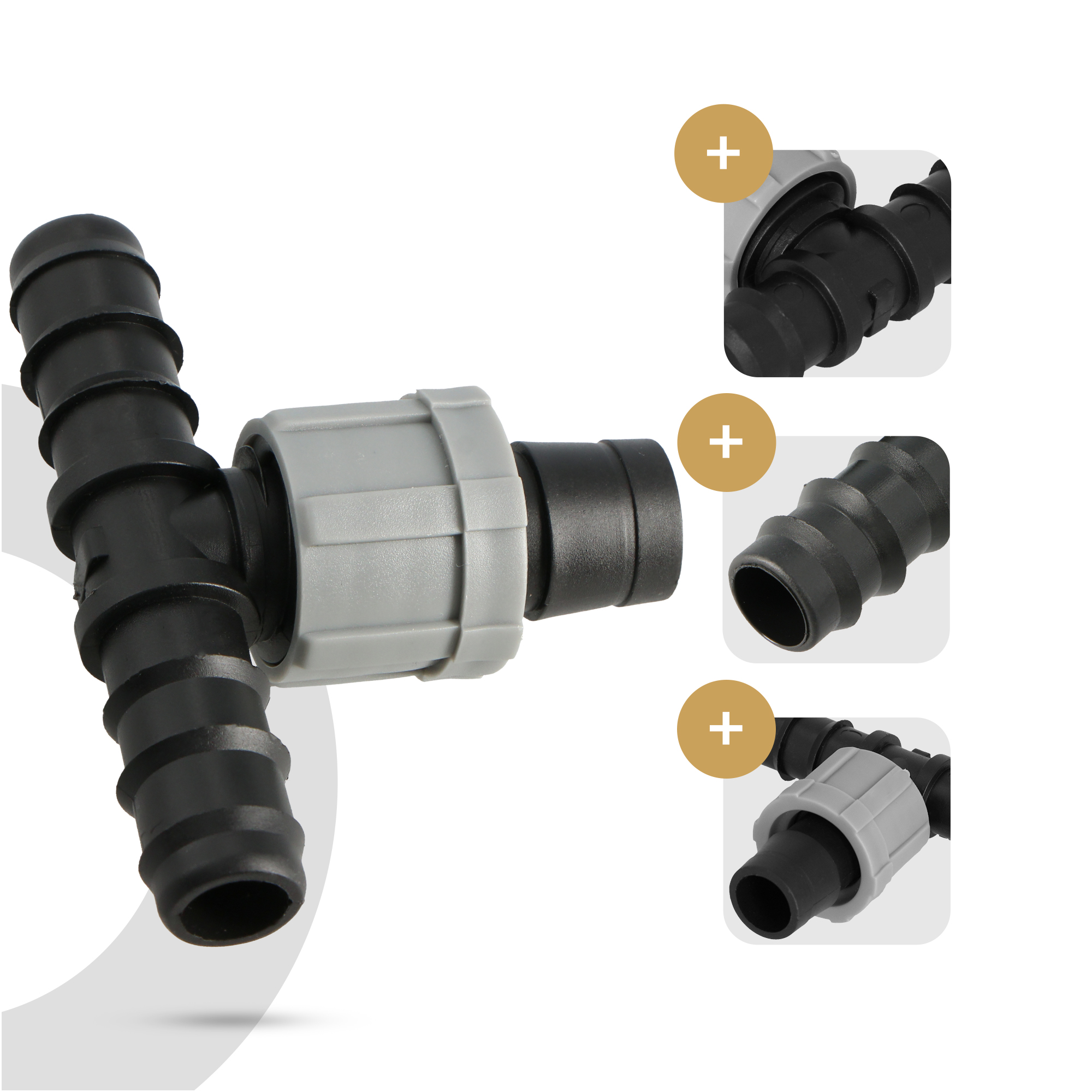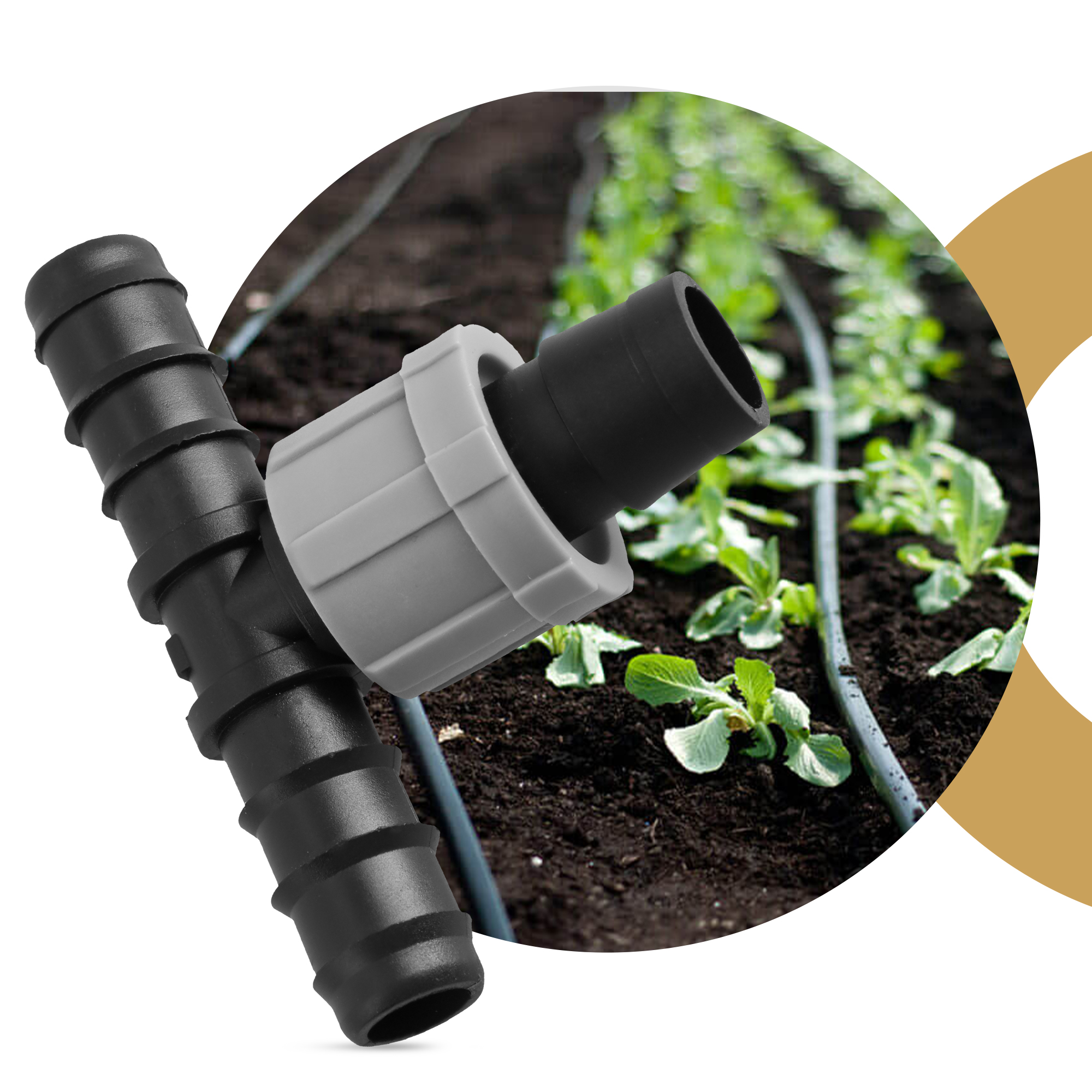 Element został zaprojektowany specjalnie do taśm kroplujących. To zapewnia dokładne dopasowanie, a uzyskane połączenie jest odporne na przeciekanie. Skręcane nakładki na gwincie zapobiegają wyślizgiwaniu się przewodów. Dzięki temu system działa bez zarzutu.