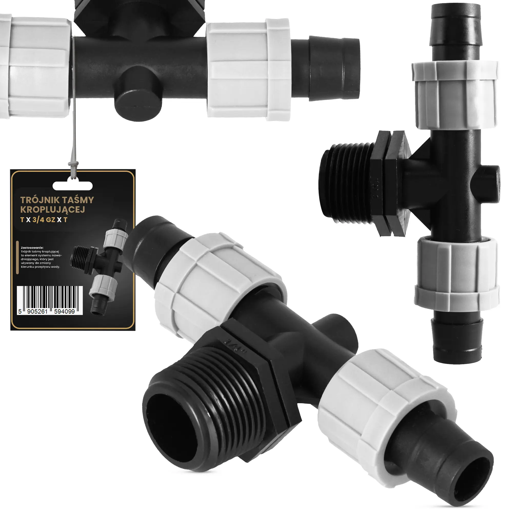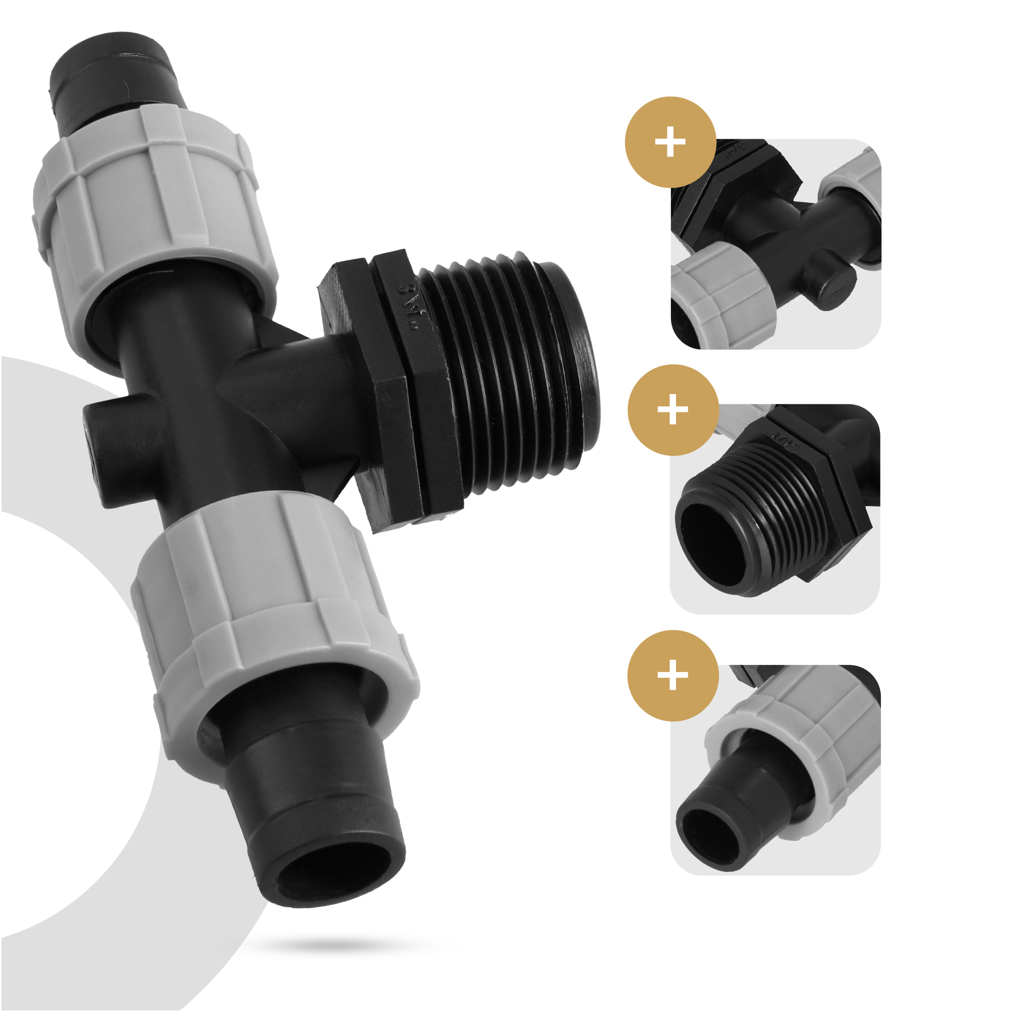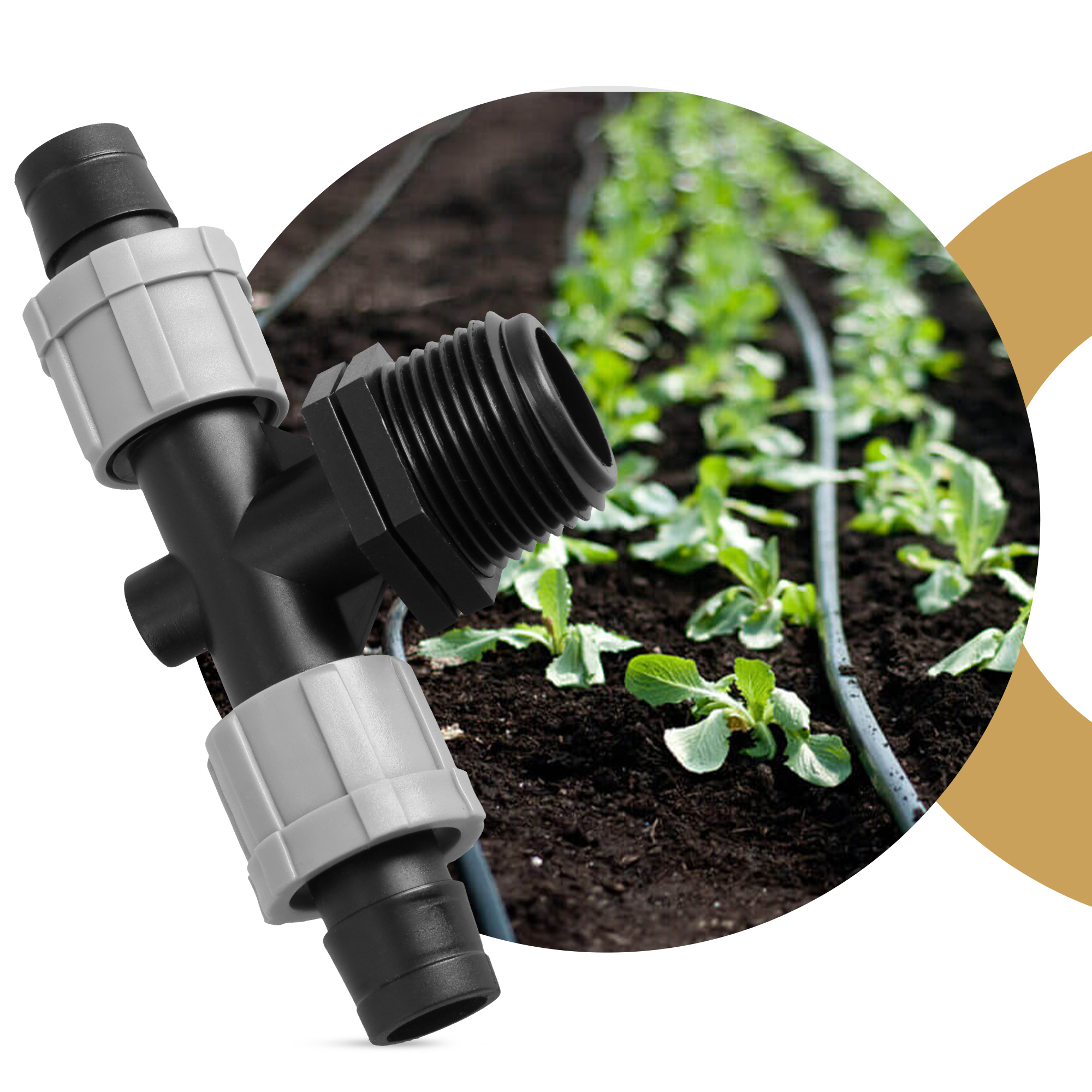 Element został zaprojektowany specjalnie do taśm kroplujących. To zapewnia dokładne dopasowanie, a uzyskane połączenie jest odporne na przeciekanie. Skręcane nakładki na gwincie zapobiegają wyślizgiwaniu się przewodów. Dzięki temu system działa bez zarzutu.