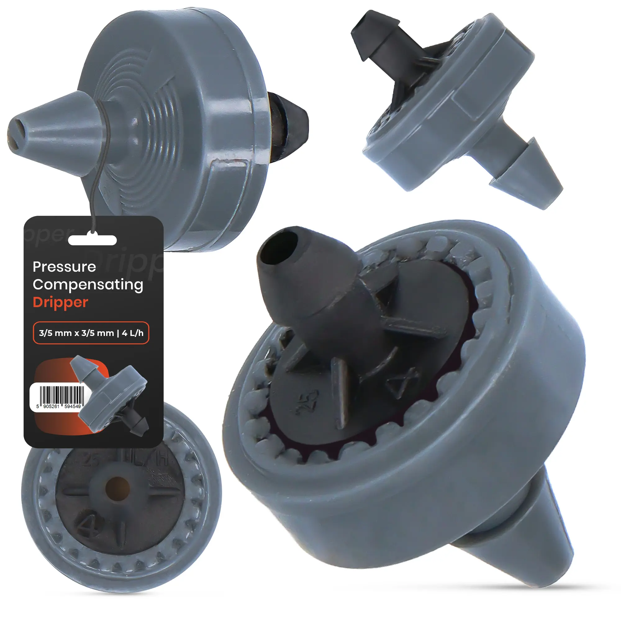 Kompensacja ciśnienia sprawia, że kroplownik dostarcza wodę do roślin niezależnie od ciśnienia zasilającego w instalacji. Dba o to specjalna membrana ukryta we wnętrzu elementu. W ten sposób wszystkie rośliny otrzymują odpowiednią ilość wody.