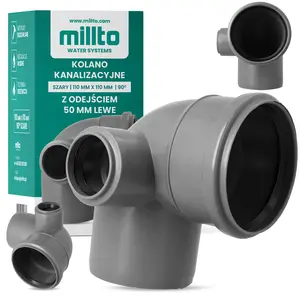 Kolano kanalizacyjne 110 mm x 110 mm 90º z odejściem 50 mm lewe szary