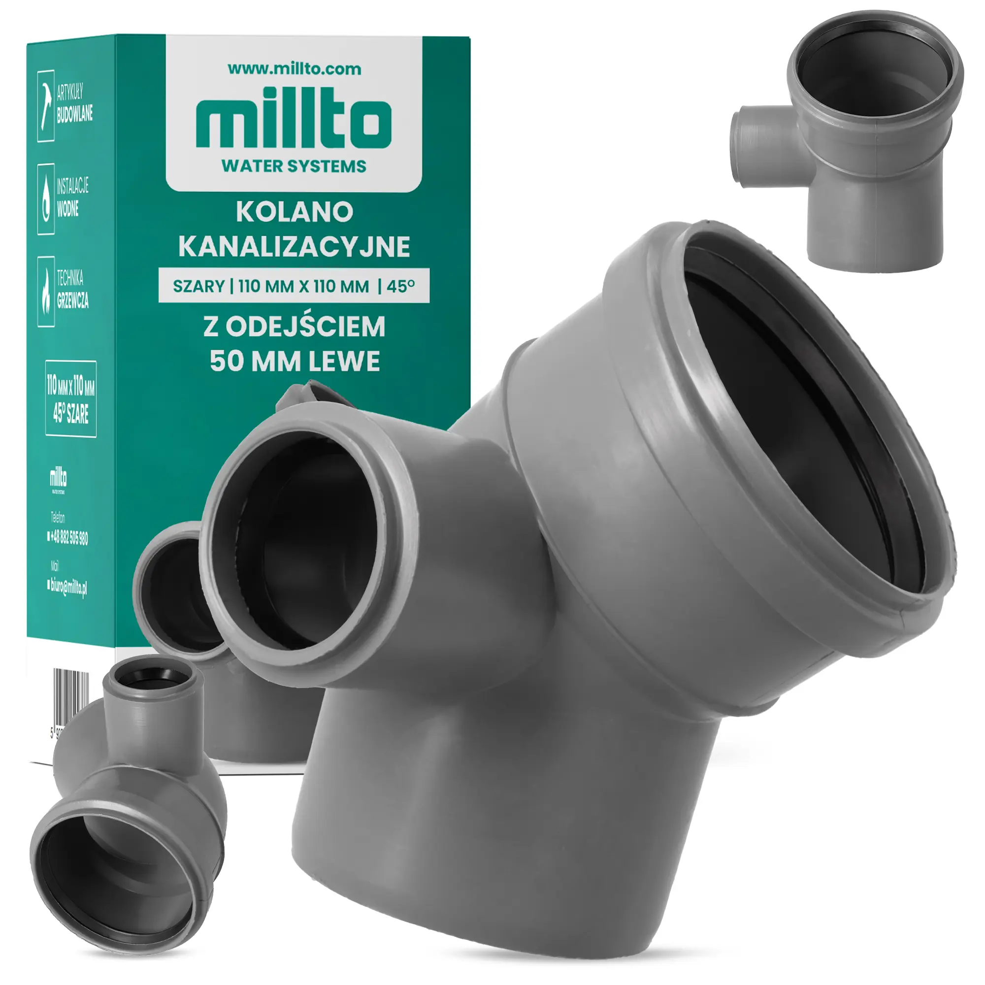 Kolano kanalizacyjne 110 mm x 110 mm 45º z odejściem 50 mm lewe szary