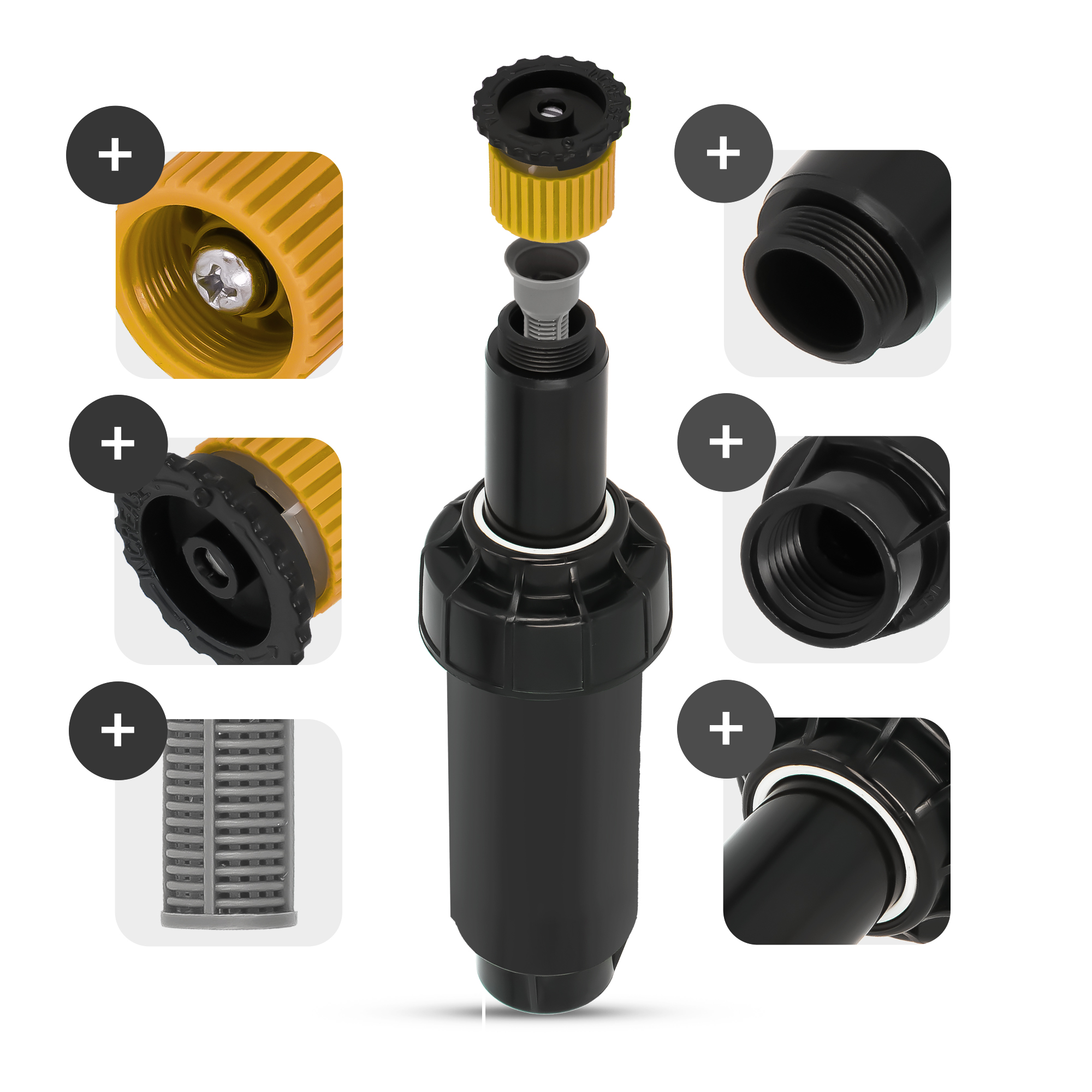 Zraszacz został wyposażony w uszczelkę, która ma właściwości samoczyszczące. Została ona precyzyjnie dopasowana do obudowy zraszacza, co gwarantuje, że nie będzie przeciekał ani nie będzie narażony na awarie. Z kolei dyszę wyróżnia filtr siatkowy. Ten eliminuje wszelkiego rodzaju zanieczyszczenia i brud. Dzięki temu możesz cieszyć się bezawaryjnym nawadnianiem przez długi czas.