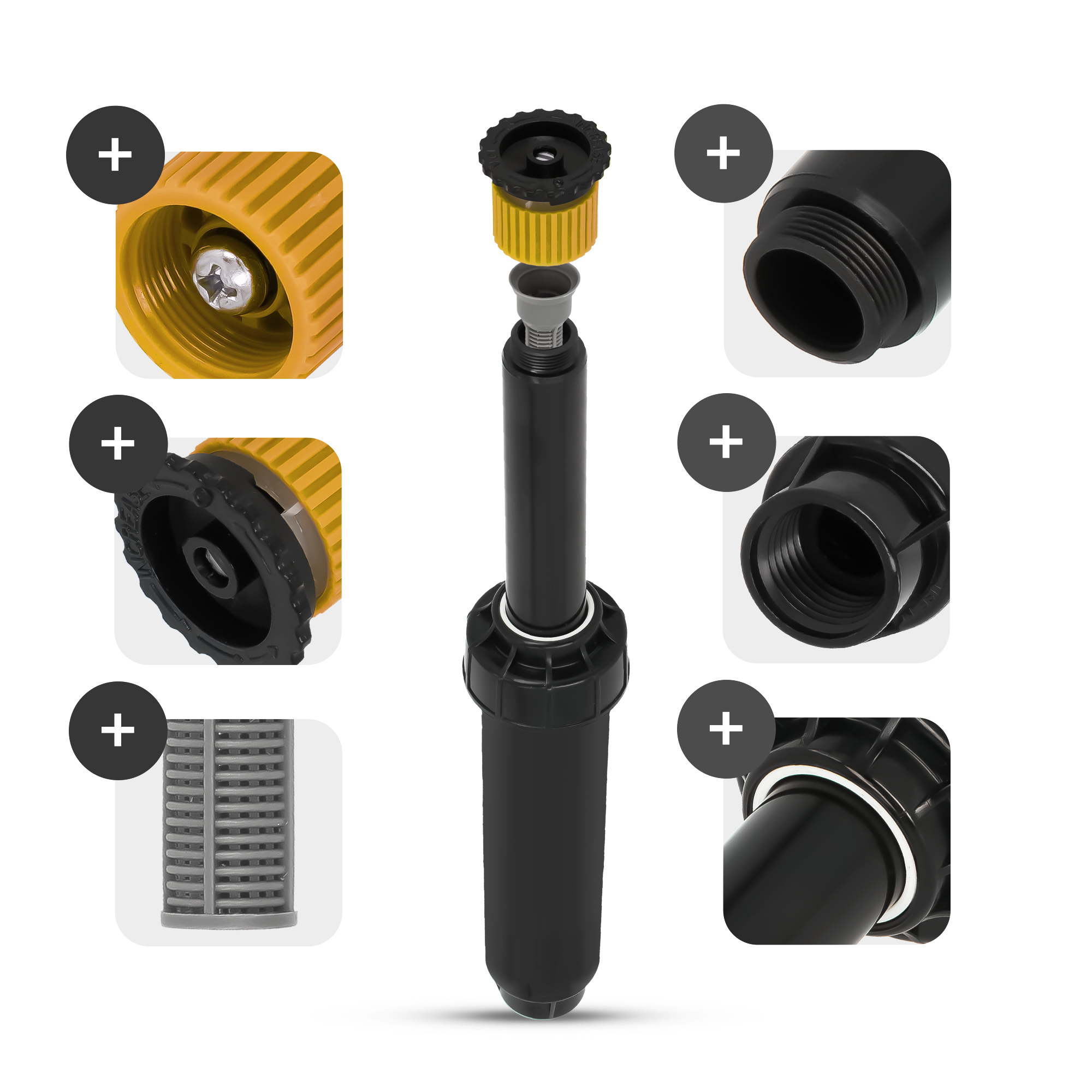 Zraszacz został wyposażony w uszczelkę, która ma właściwości samoczyszczące. Została ona precyzyjnie dopasowana do obudowy zraszacza, co gwarantuje, że nie będzie przeciekał ani nie będzie narażony na awarie. Z kolei dyszę wyróżnia filtr siatkowy. Ten eliminuje wszelkiego rodzaju zanieczyszczenia i brud. Dzięki temu możesz cieszyć się bezawaryjnym nawadnianiem przez długi czas.