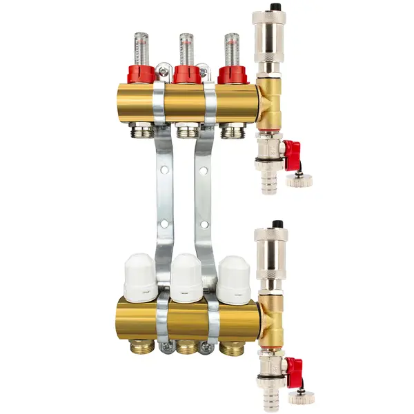 Rozdzielacz CO mosiężne do podłogówki 50 - uzbrojony (odpowietrzniki automatyczne, trójniki, zawory spustowe) 3 obwody
