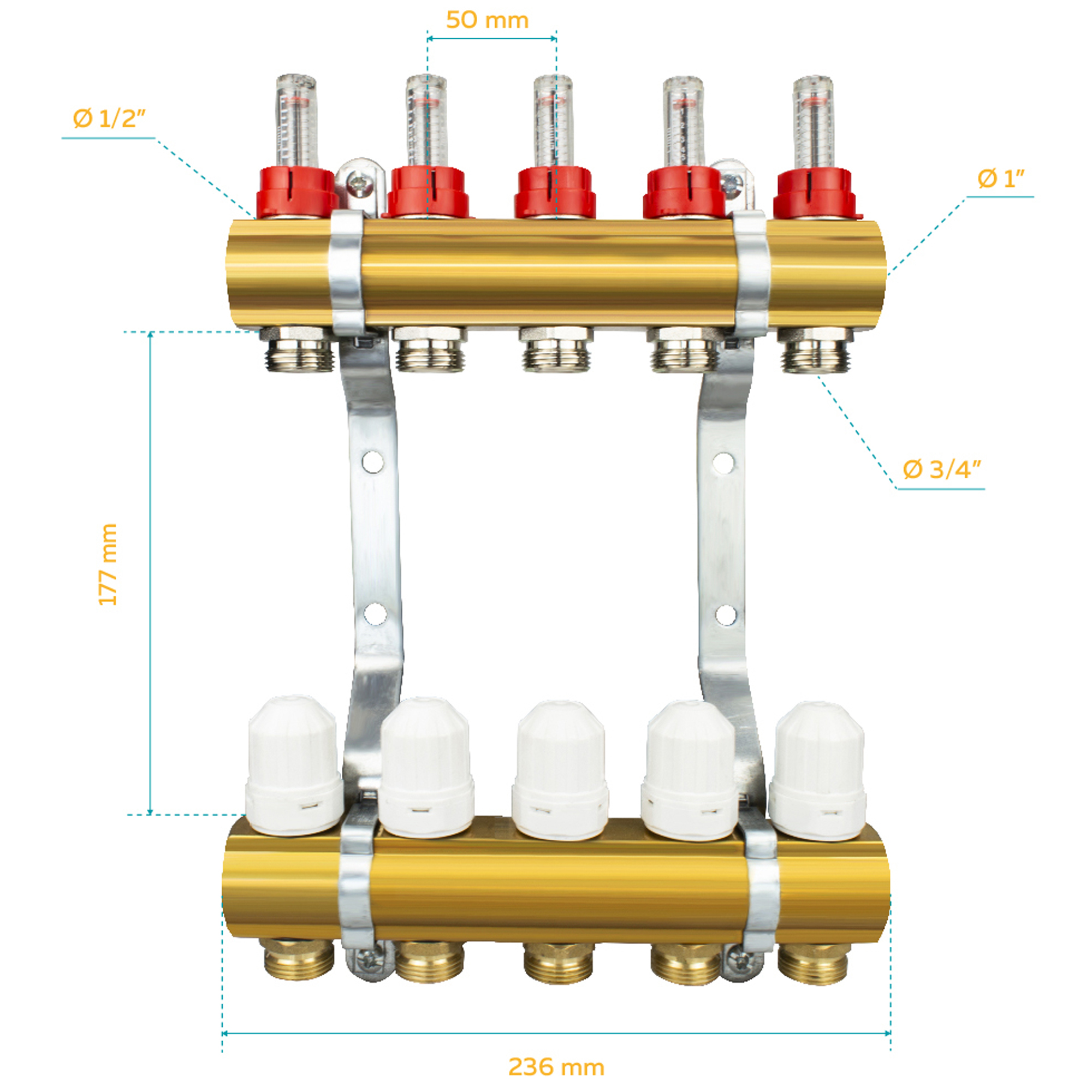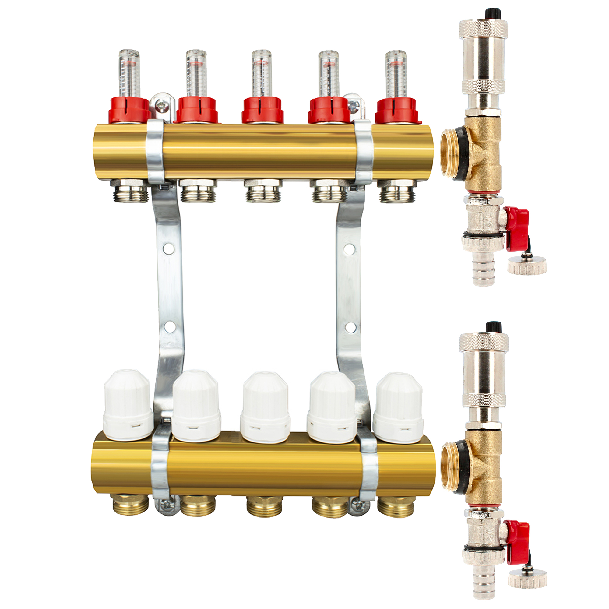 Rozdzielacz CO mosiężne do podłogówki 50 - uzbrojony (odpowietrzniki automatyczne, trójniki, zawory spustowe) 5 obwodów | Kup Online!