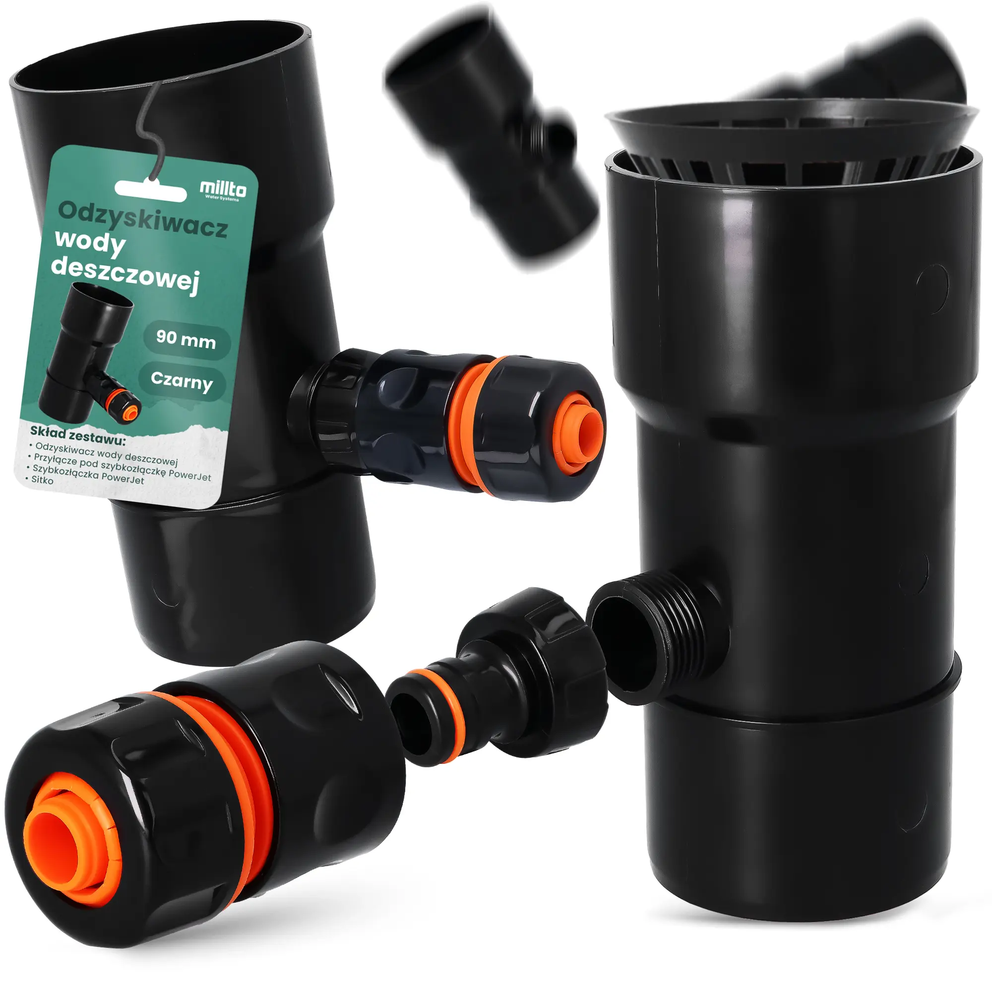 Odzyskiwacz wody deszczowej 90 mm x 1'' GZ czarny z przyłączem pod szybkozłączke 1'' GW x SZ PowerJet i szybkozłączka 3/4'' W x SZ PowerJet