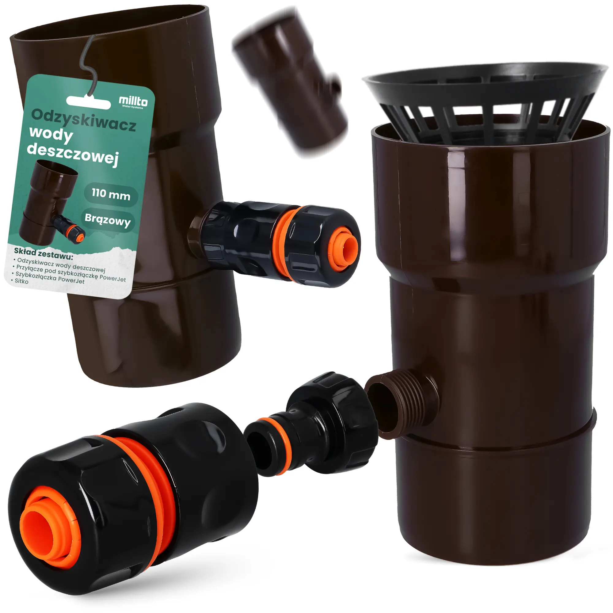 Odzyskiwacz wody deszczowej 110 mm x 1'' GZ brązowy z przyłączem pod szybkozłączke 1'' GW x SZ PowerJet i szybkozłączka 3/4'' W x SZ PowerJet