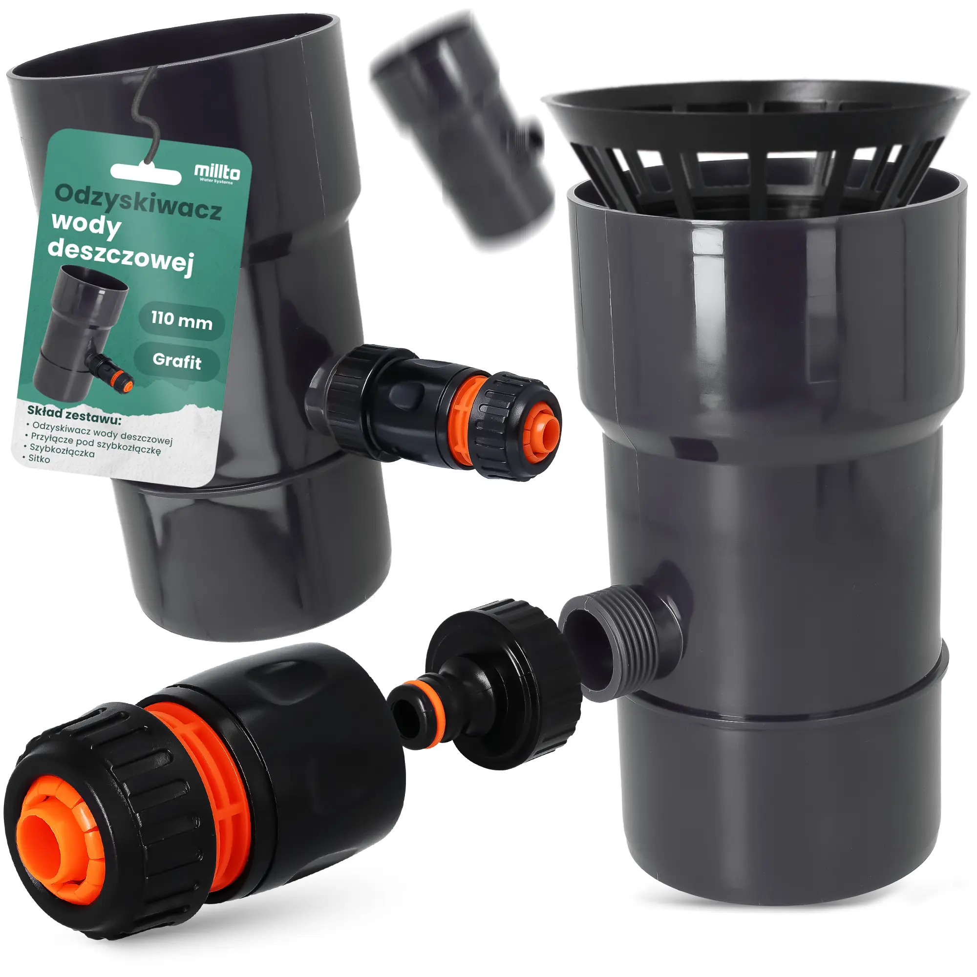 Odzyskiwacz wody deszczowej 110 mm x 1'' GZ grafit z przyłączem pod szybkozłączke 1'' GW x SZ i szybkozłączka 1/2'' W x SZ