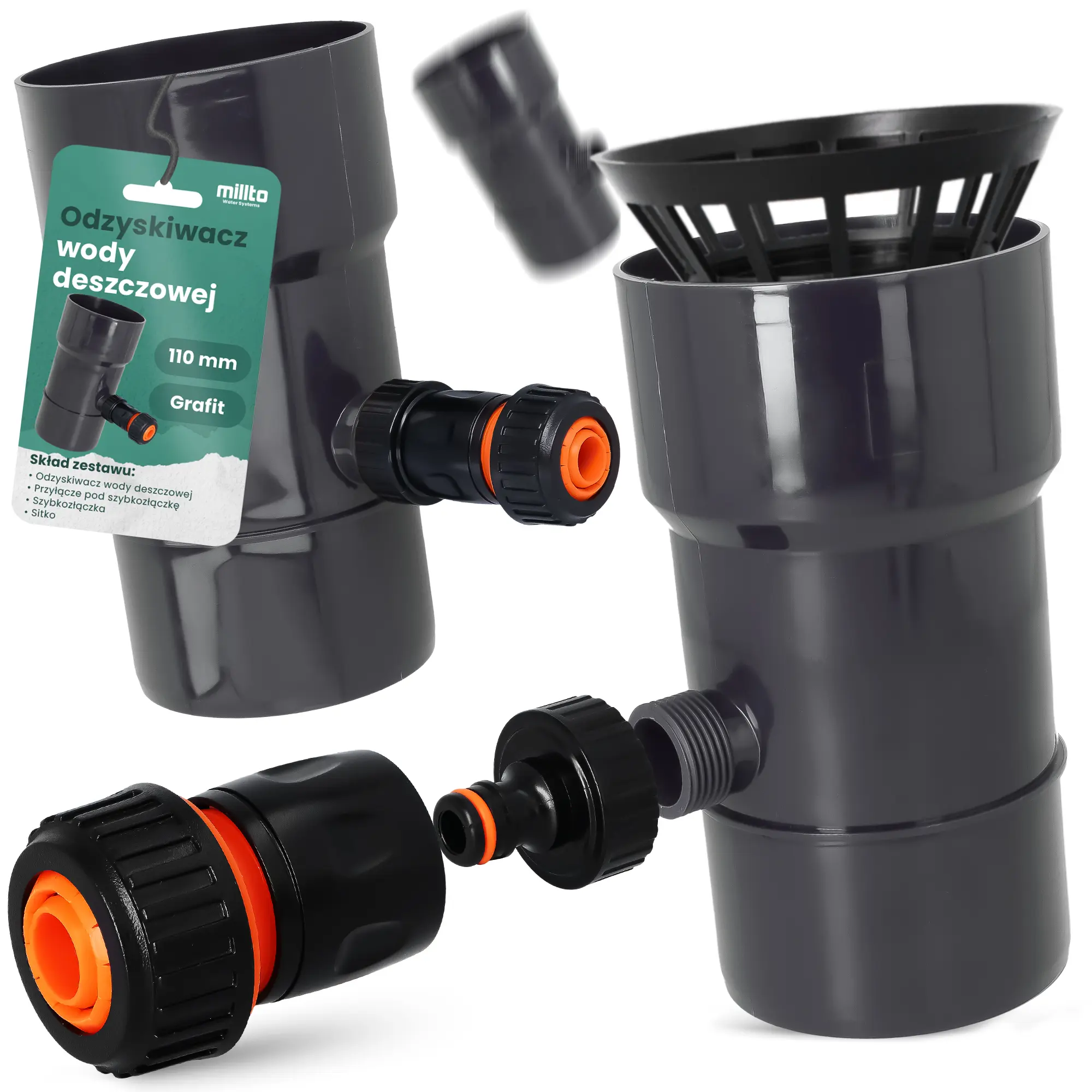 Odzyskiwacz wody deszczowej 110 mm x 1'' GZ grafit z przyłączem pod szybkozłączke 1'' GW x SZ i szybkozłączka 3/4'' W x SZ