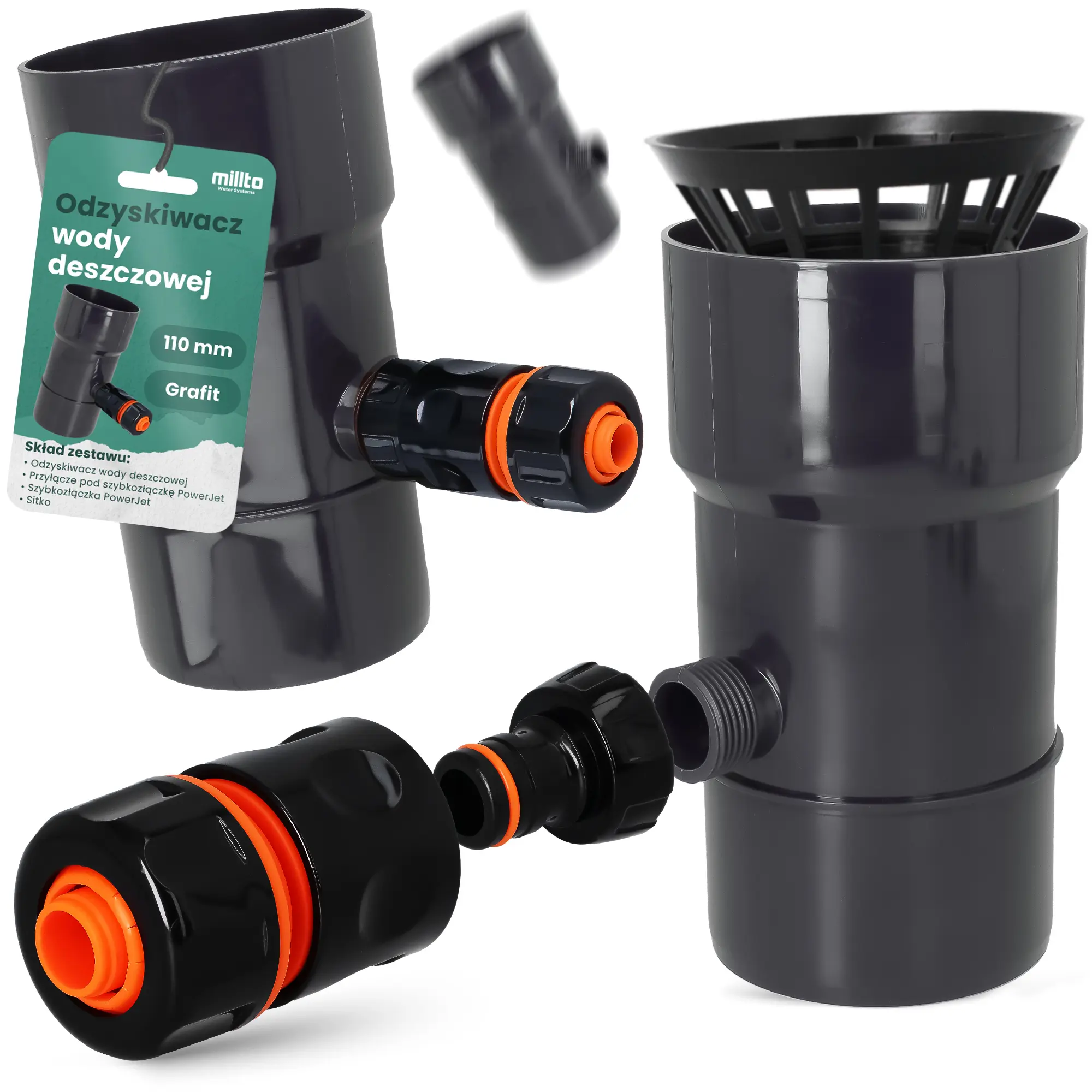 Odzyskiwacz wody deszczowej 110 mm x 1'' GZ grafit z przyłączem pod szybkozłączke 1'' GW x SZ PowerJet i szybkozłączka 3/4'' W x SZ PowerJet | Kup Online!