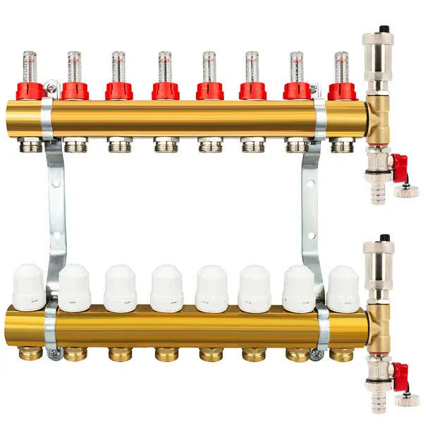 Rozdzielacz CO mosiężne do podłogówki 50 - uzbrojony (odpowietrzniki automatyczne, trójniki, zawory spustowe) 8 obwodów
