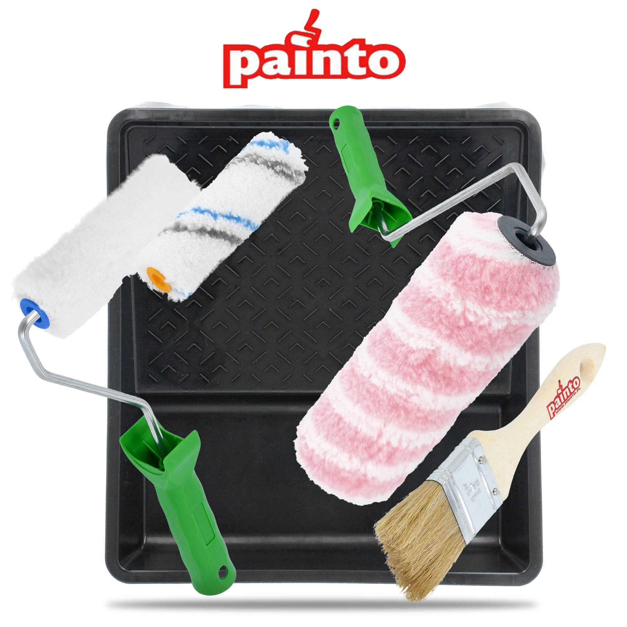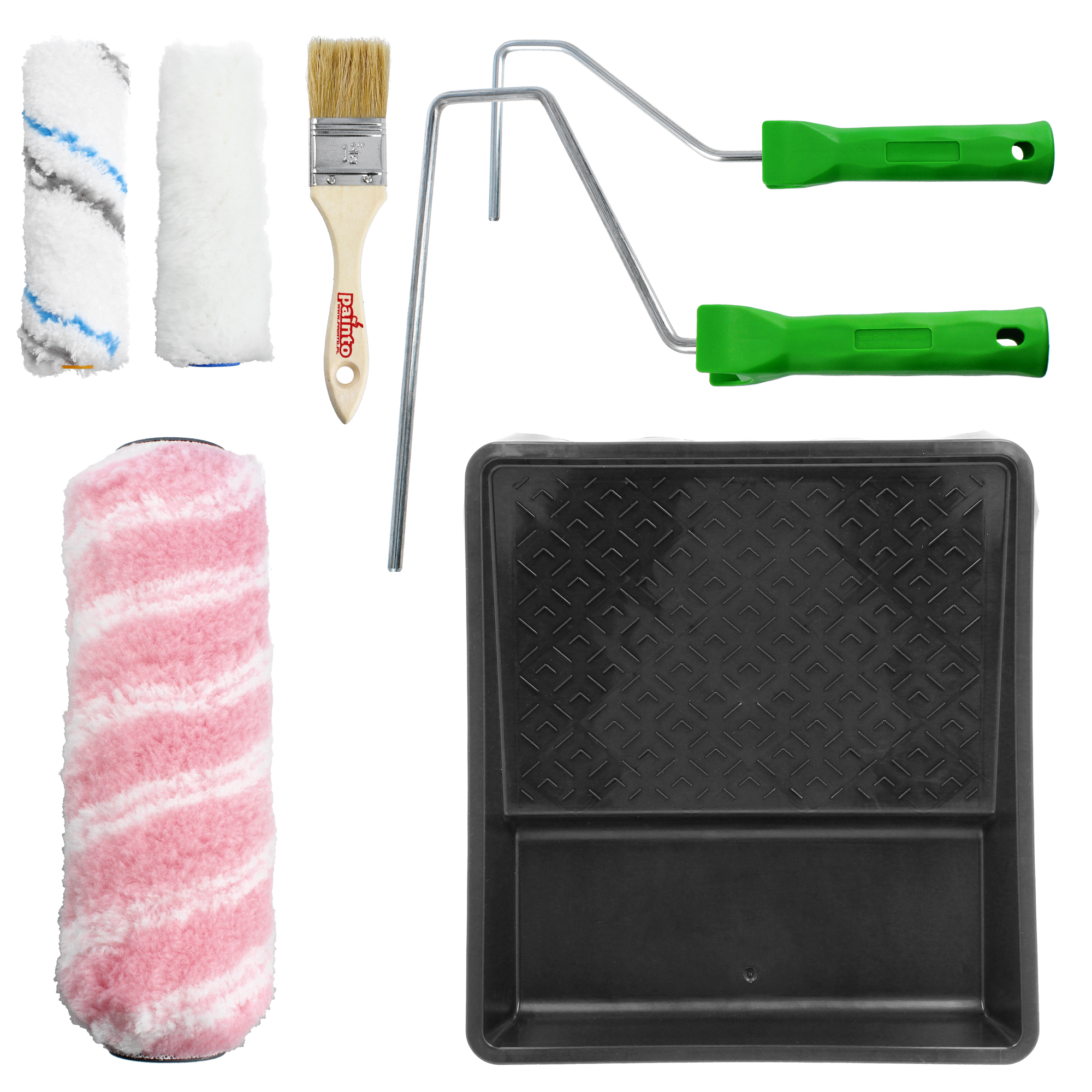 Skład zestawu | Kuweta, 2 uchwyty na wałek 10, 25 cm, 2 wałki 10 cm, wałek 25 cm, pędzel |
