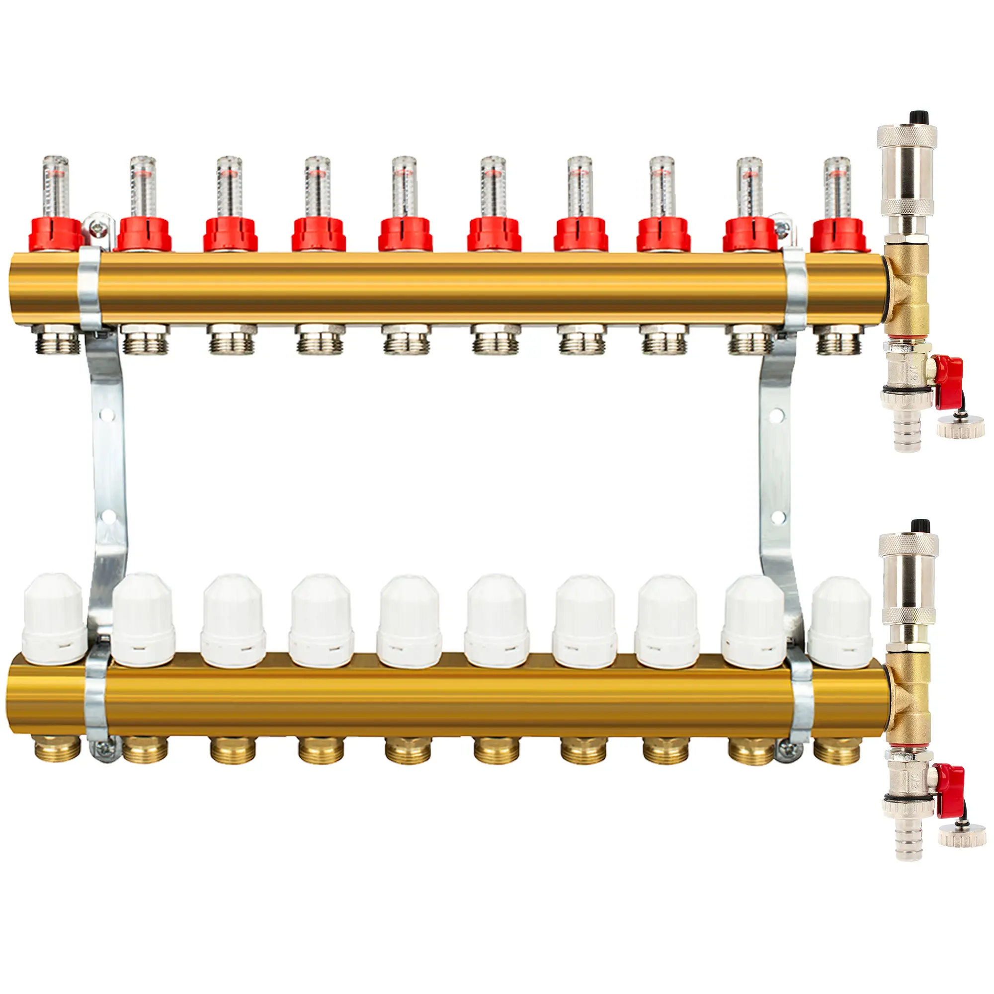 Rozdzielacz CO mosiężne do podłogówki 50 - uzbrojony (odpowietrzniki automatyczne, trójniki, zawory spustowe) 10 obwodów