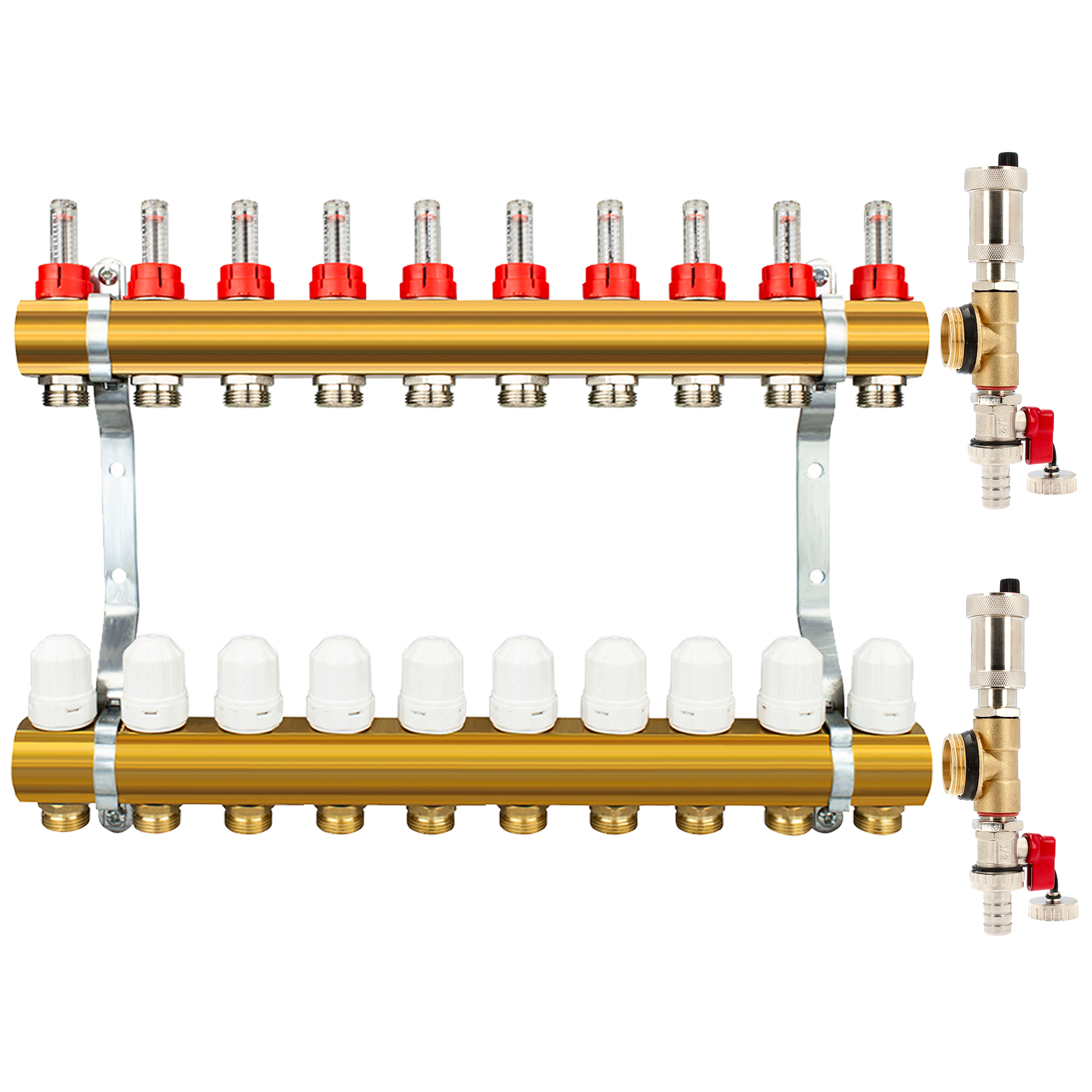 Rozdzielacz CO mosiężne do podłogówki 50 - uzbrojony (odpowietrzniki automatyczne, trójniki, zawory spustowe) 10 obwodów | Kup Online!
