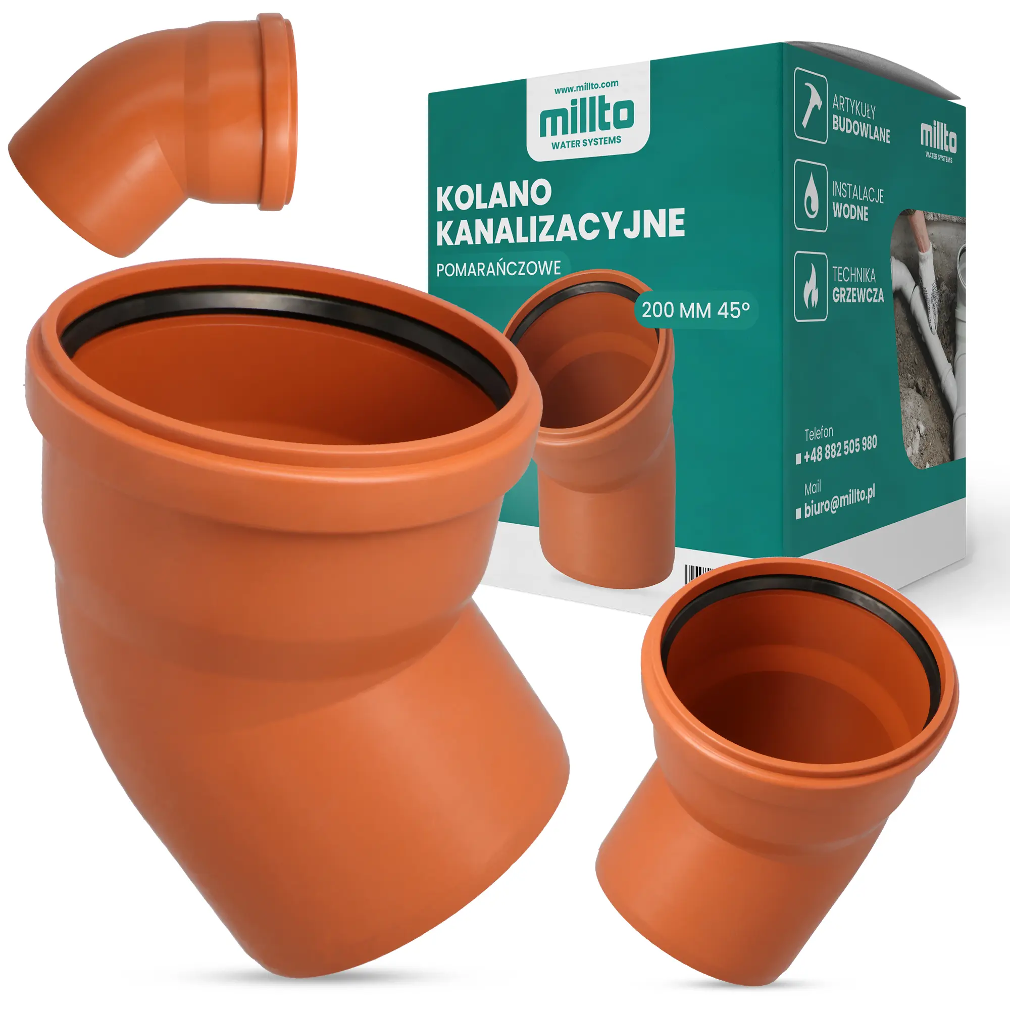 Kolano kanalizacyjne 200 mm x 200 mm 45º pomarańczowe