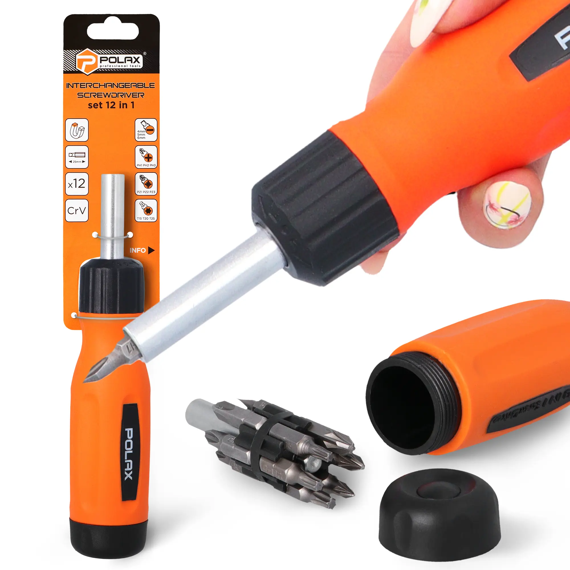 Z tym wkrętakiem żadna śruba Cię nie zaskoczy. 12 różnych końcówek pozwala obsłużyć większość typów złączy, które spotykasz na co dzień.