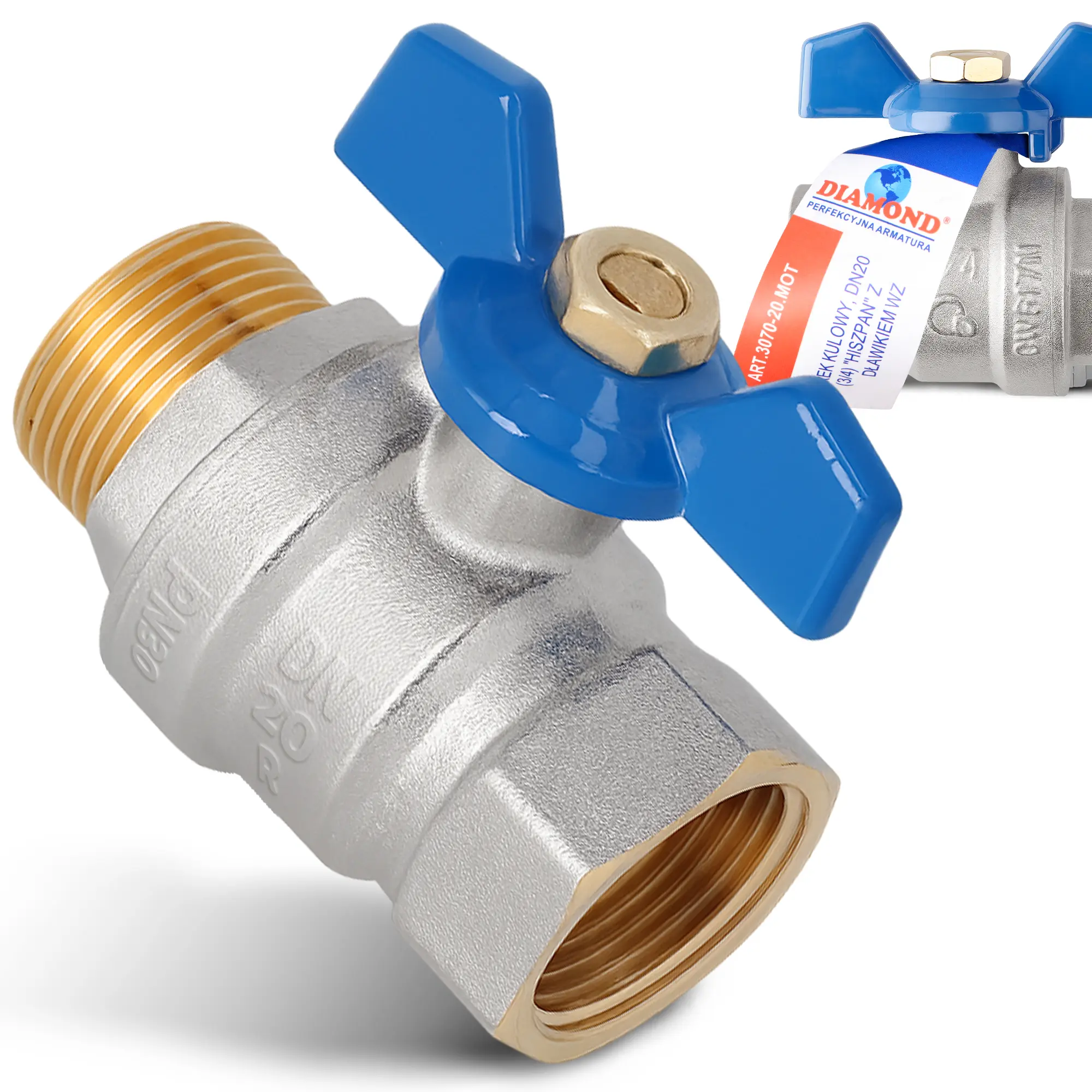 Precyzyjnie wykonany zawór kulowy z niklowaną powierzchnią i aluminiowym uchwytem motylkowym.