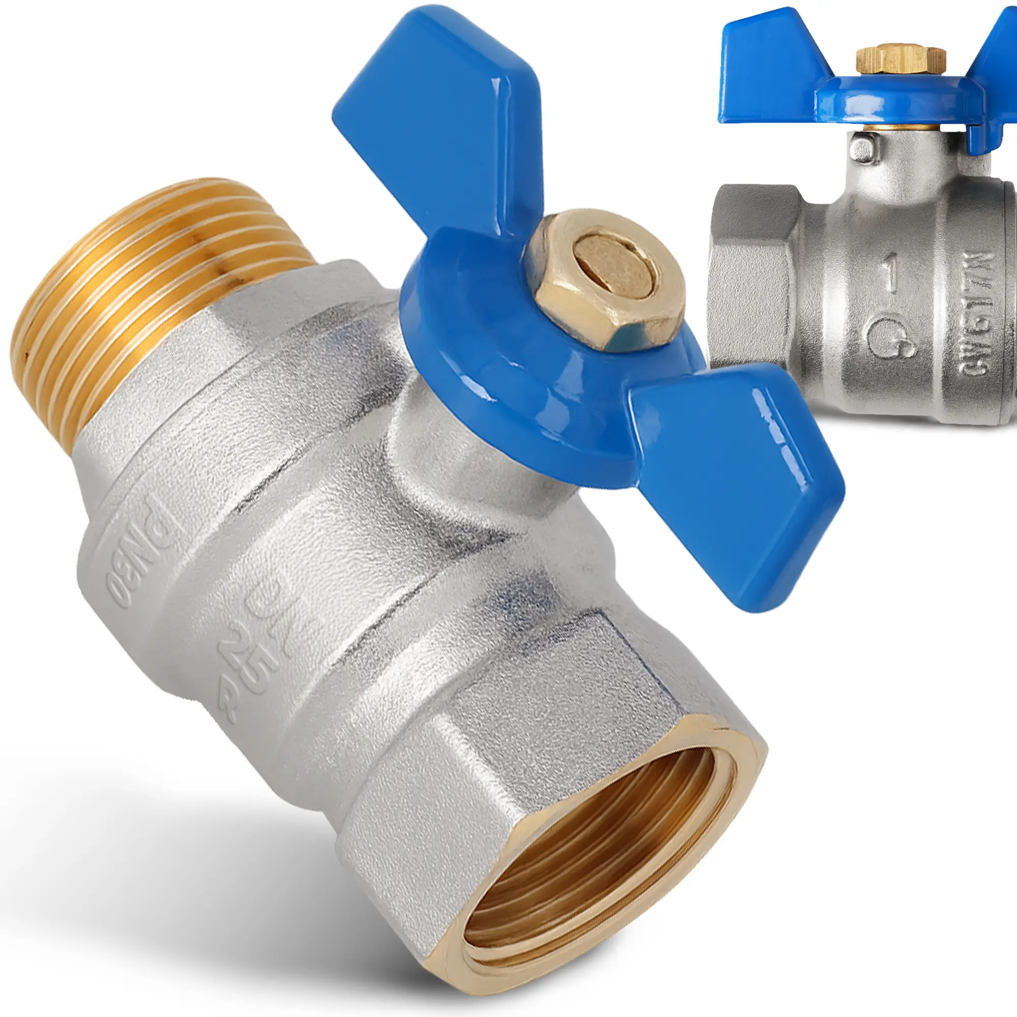 Precyzyjnie wykonany zawór kulowy z niklowaną powierzchnią i aluminiowym uchwytem motylkowym.