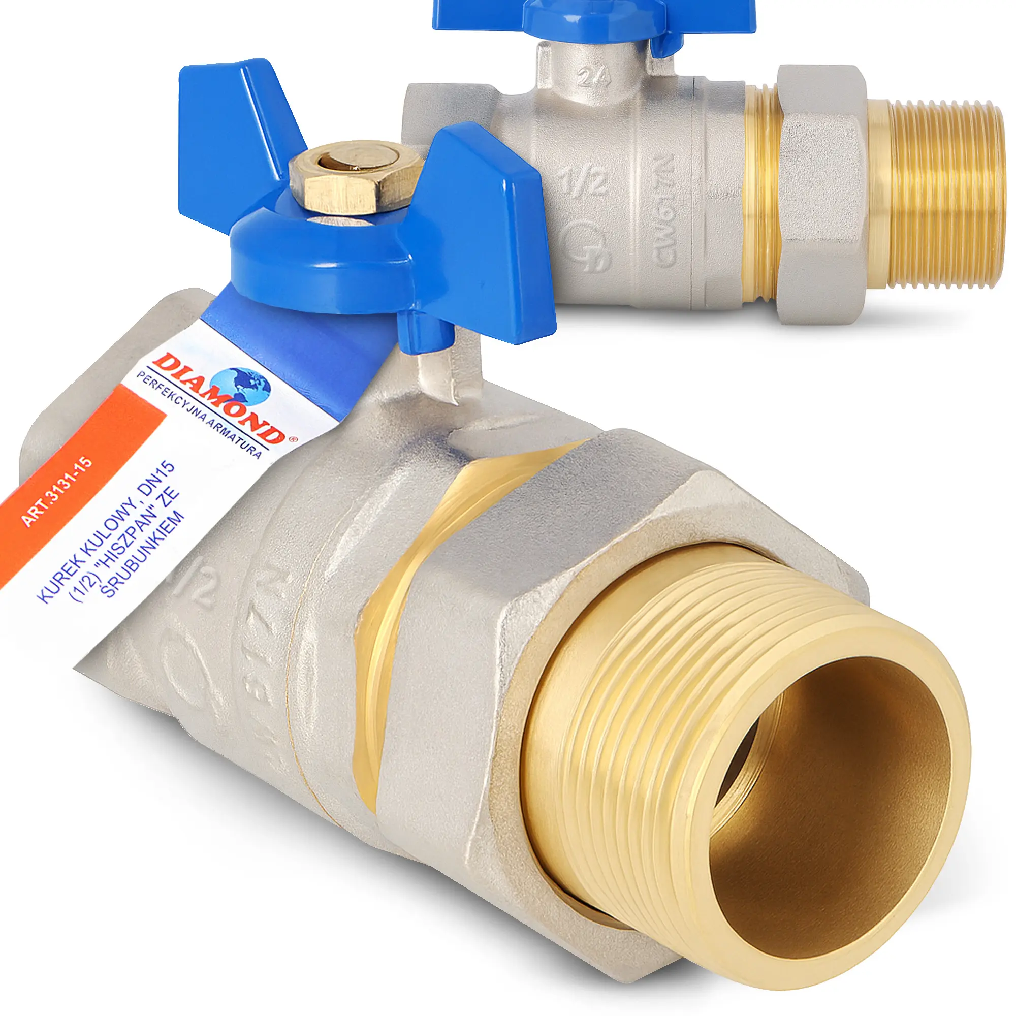 Zawór kulowy motylkowy z dławikiem 30 bar 1/2'' GW x 3/4'' GZ i śrubunkiem 3/4'' GW x 1/2'' GZ