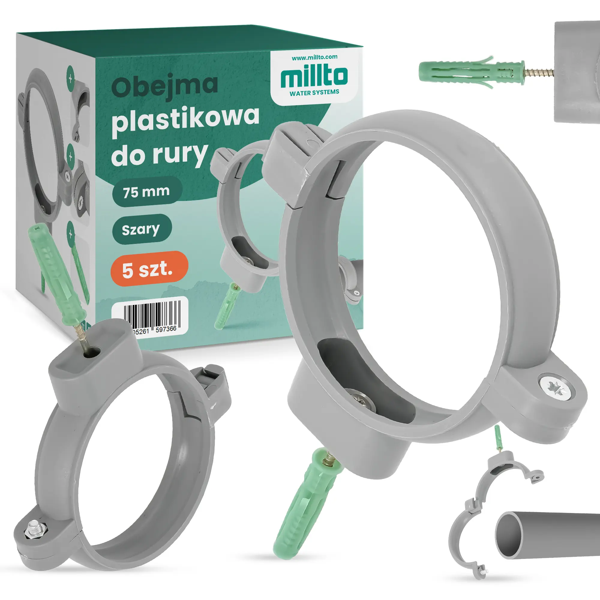 Obejma plastikowa do rury 75 mm szary 5 szt.