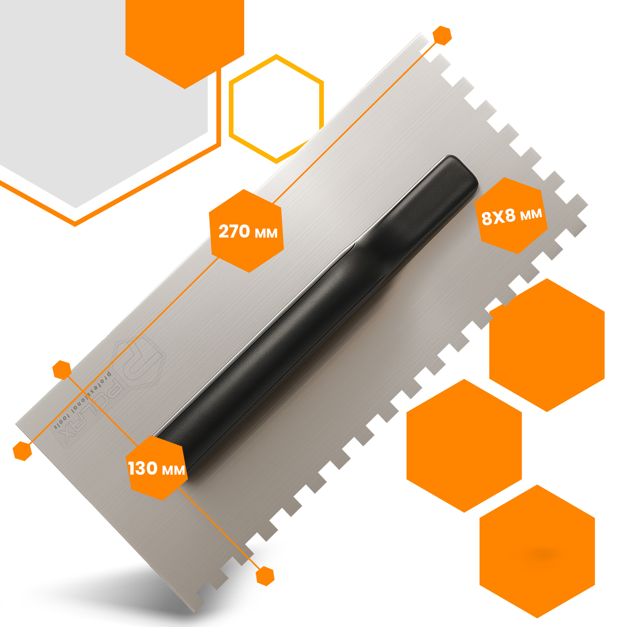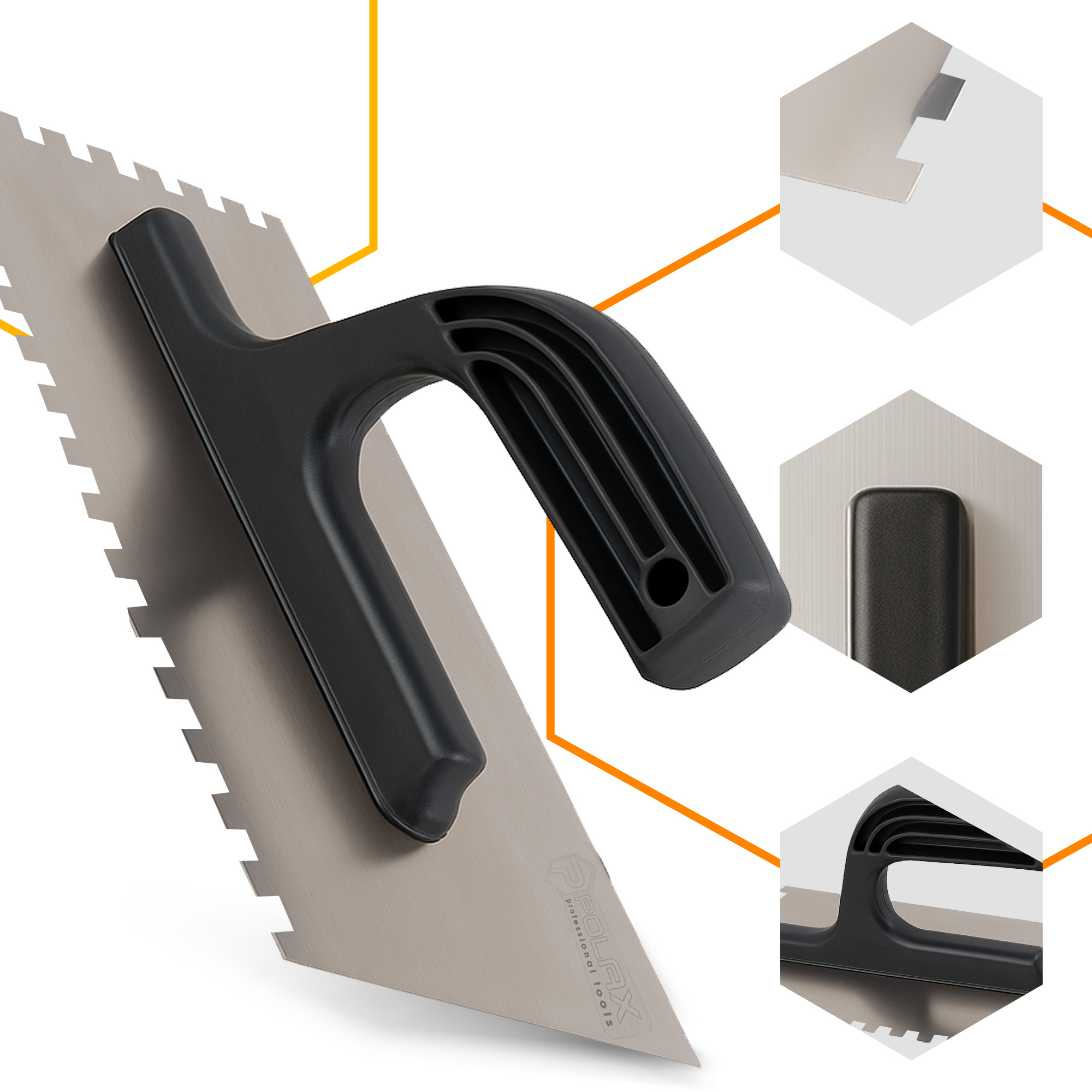 Ostrze ze stali nierdzewnej jest odporne na zużycie i pozwala na długą eksploatację. Zęby szpachelki zapewniają równą aplikację kleju, co ma kluczowe znaczenie przy układaniu płytek ceramicznych i innych materiałów.