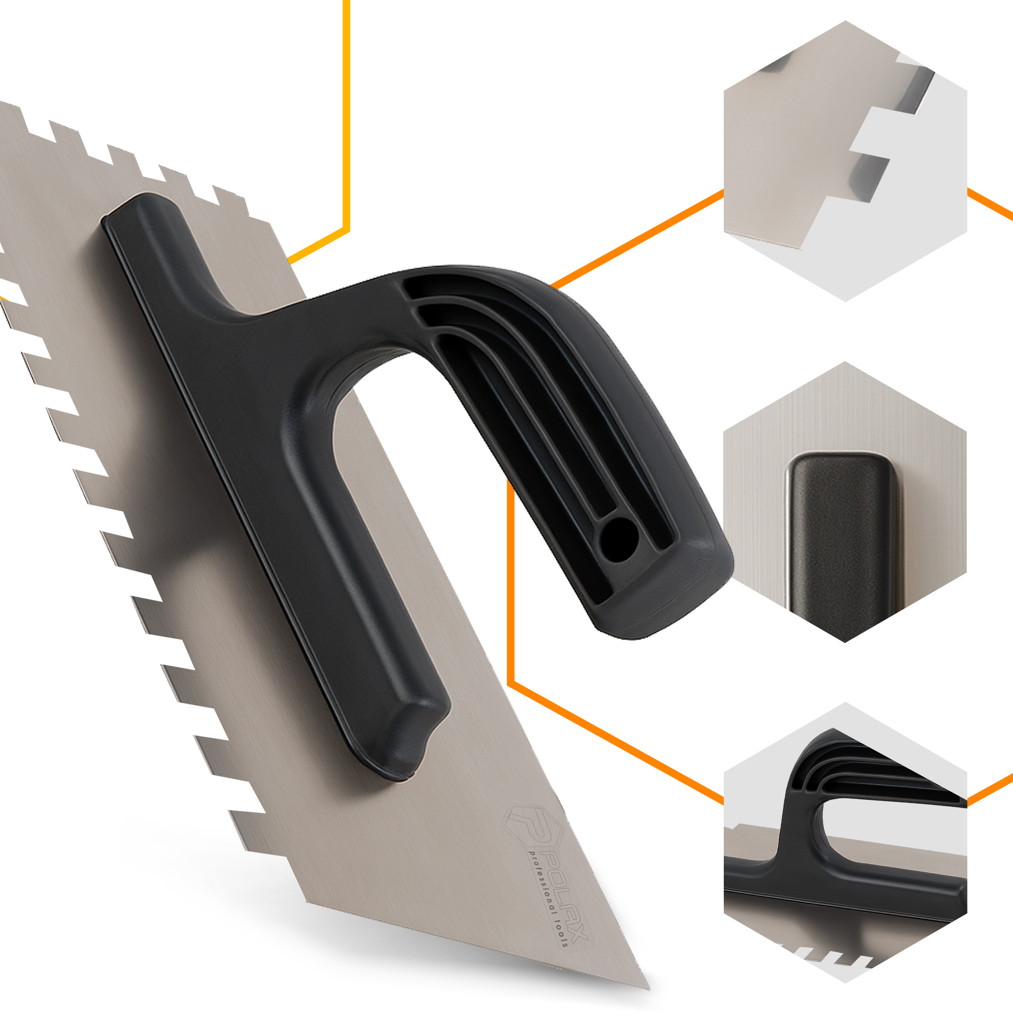 Ostrze ze stali nierdzewnej jest odporne na zużycie i pozwala na długą eksploatację. Zęby szpachelki zapewniają równą aplikację kleju, co ma kluczowe znaczenie przy układaniu płytek ceramicznych i innych materiałów.