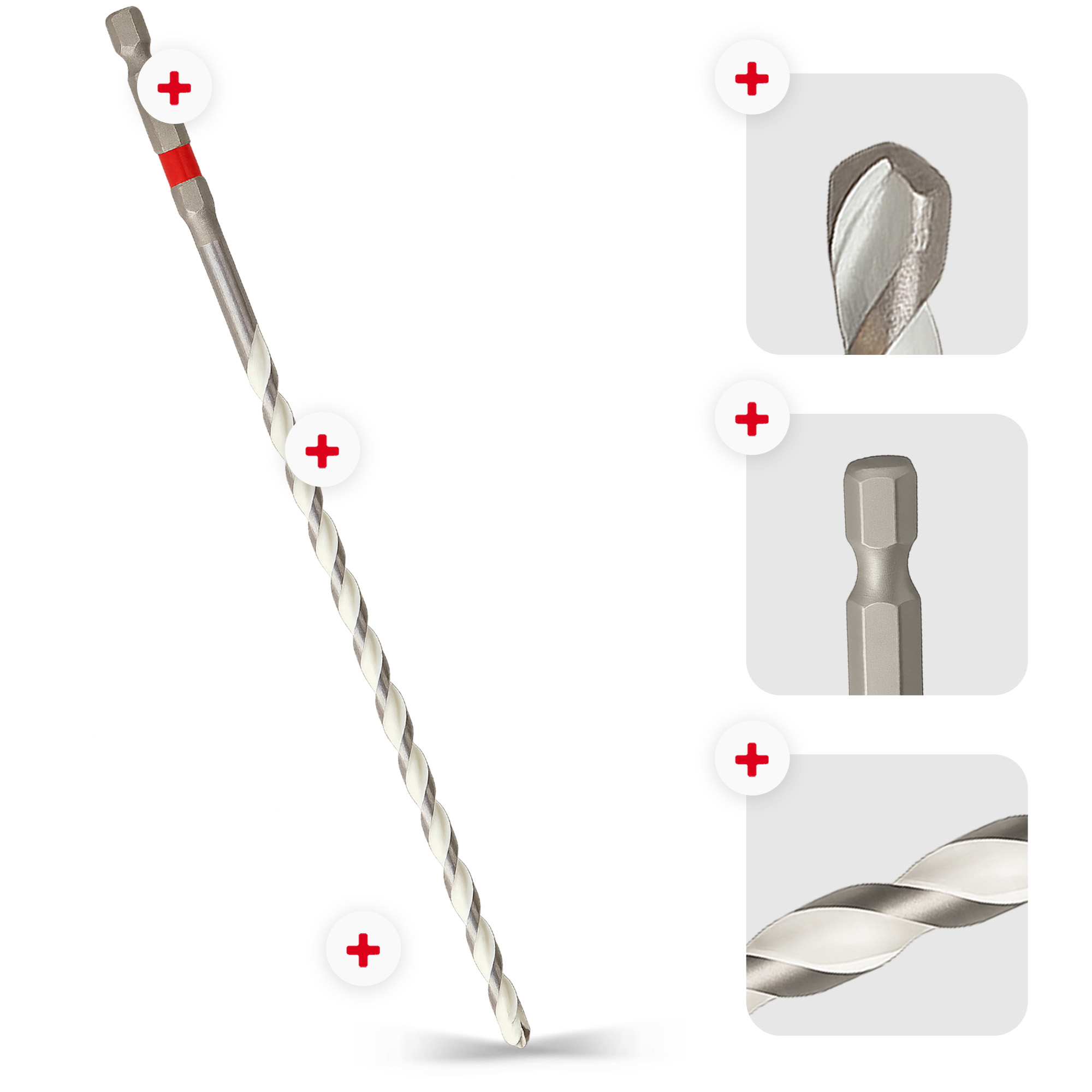 Pozwala na czyste i szybkie wiercenie w betonie, drewnie, płytkach czy aluminium. Konstrukcja z mocnym uchwytem zapewnia pewne mocowanie w narzędziu, co przekłada się na komfort użytkowania. Dodatkowo kontrastowe żłobienie pomaga łatwo zlokalizować wiertło wśród innych akcesoriów.