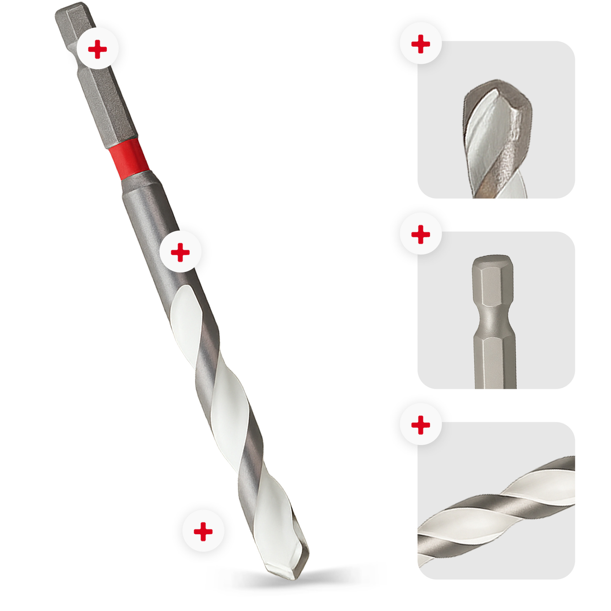 Pozwala na czyste i szybkie wiercenie w betonie, drewnie, płytkach czy aluminium. Konstrukcja z mocnym uchwytem zapewnia pewne mocowanie w narzędziu, co przekłada się na komfort użytkowania. Dodatkowo kontrastowe żłobienie pomaga łatwo zlokalizować wiertło wśród innych akcesoriów.