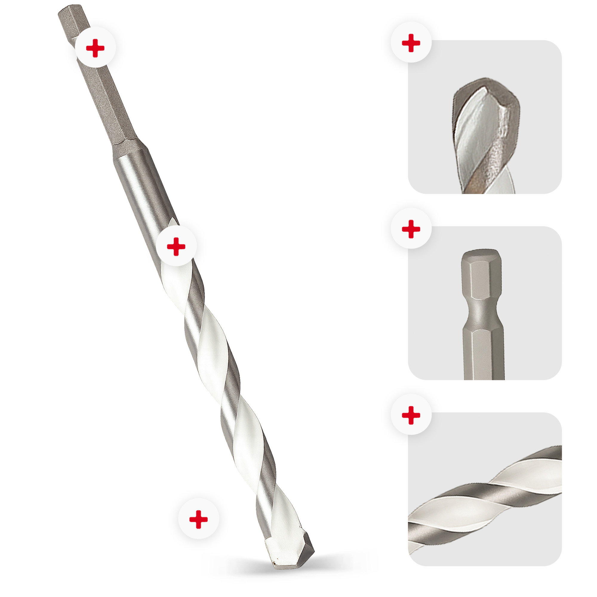 Pozwala na czyste i szybkie wiercenie w betonie, drewnie, płytkach czy aluminium. Konstrukcja z mocnym uchwytem zapewnia pewne mocowanie w narzędziu, co przekłada się na komfort użytkowania. Dodatkowo kontrastowe żłobienie pomaga łatwo zlokalizować wiertło wśród innych akcesoriów.