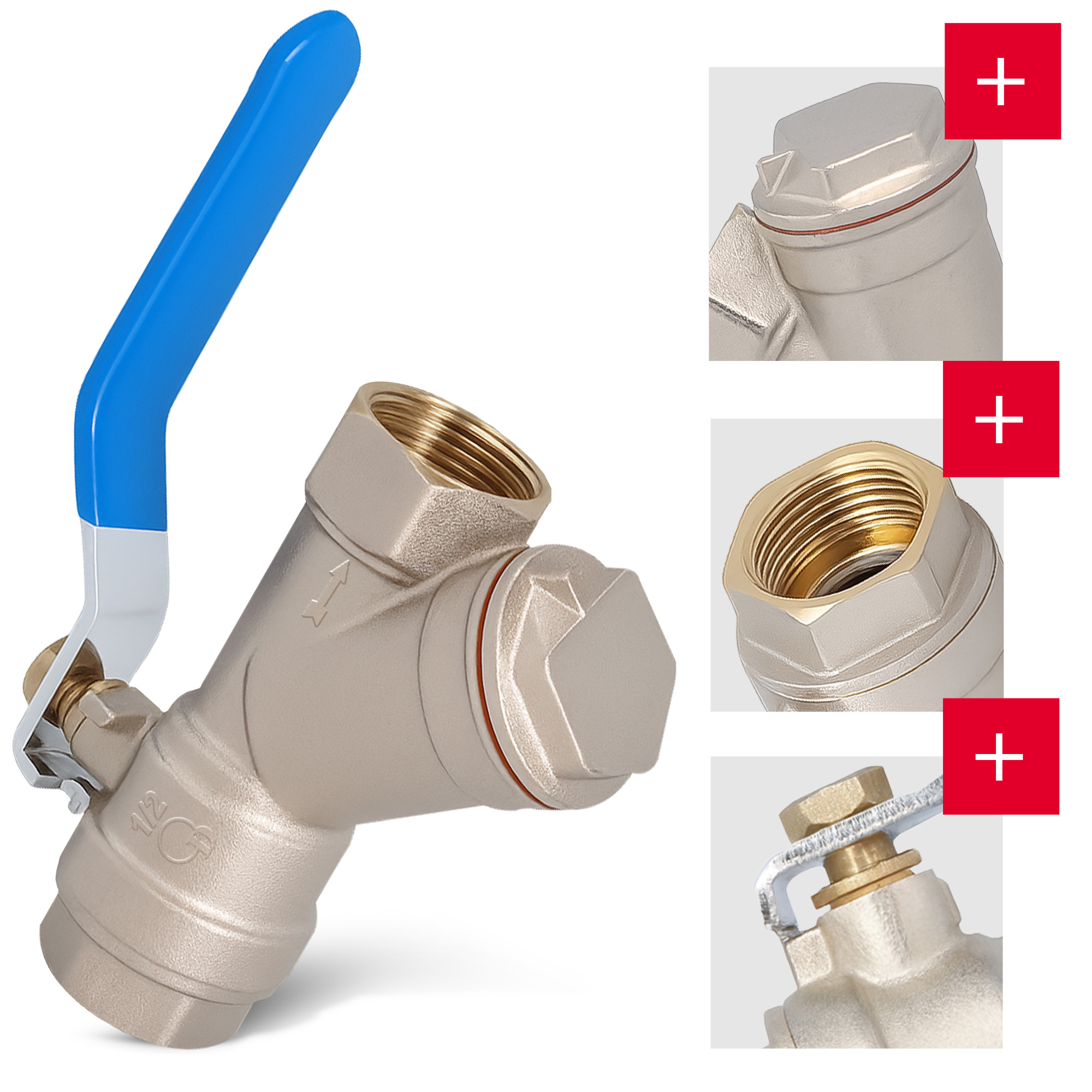 Kula uszczelniona PTFE zapewnia niezawodną kontrolę nad przepływem cieczy. Stalowa rączka umożliwia łatwe otwieranie i zamykanie zaworu w codziennym użytkowaniu. Oznaczenia naniesione na korpus są trwałe i zgodne z obowiązującymi normami europejskimi.