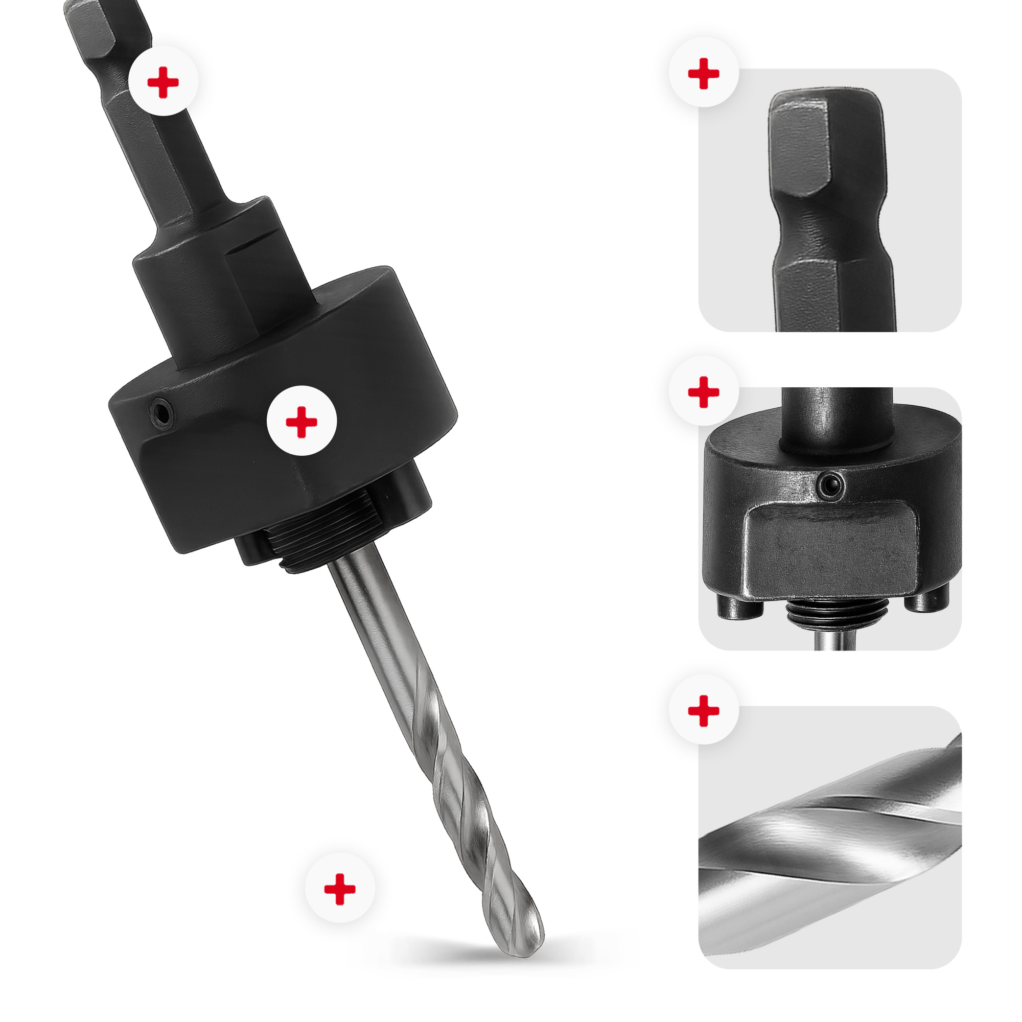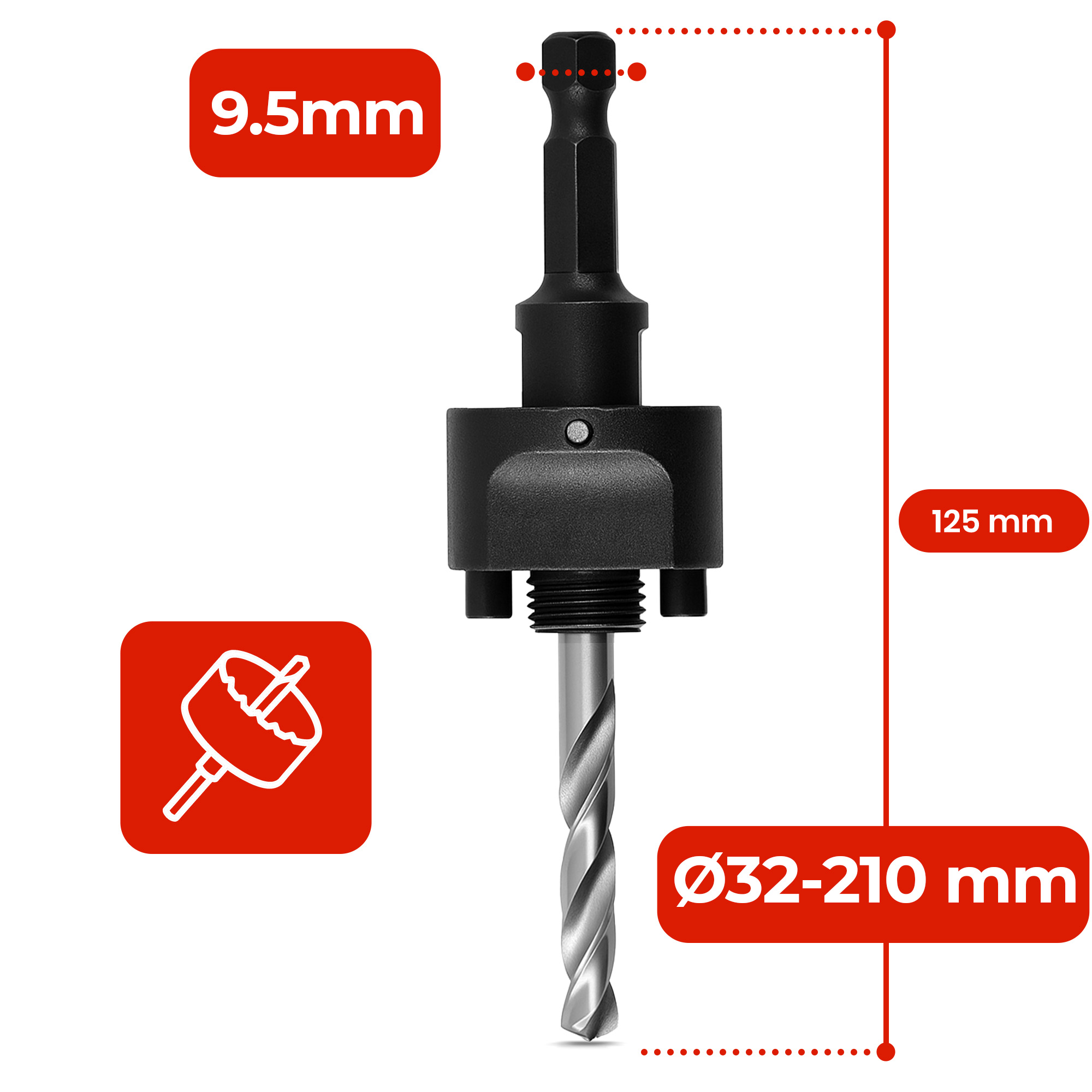 Jest wyposażony w trzpień mocujący, który gwarantuje trwałe osadzenie otwornicy i ogranicza ryzyko jej luzowania się podczas pracy. Wiertło centrujące wspomaga dokładne rozpoczęcie wiercenia i ułatwia prowadzenie narzędzia po powierzchni materiału.