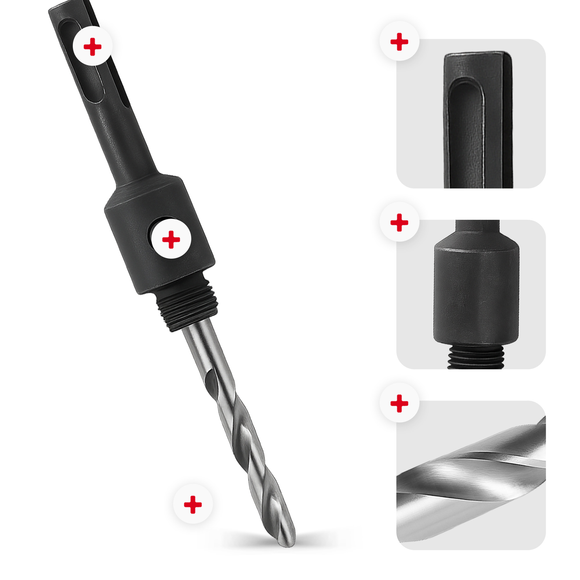 Jest wyposażony w wiertło centrujące, które ułatwia precyzyjne rozpoczęcie wiercenia. Solidna końcówka SDS-Plus umożliwia szybki montaż i demontaż bez użycia narzędzi. Dzięki kompatybilności z wieloma otwornicami adapter rozszerza możliwości wiertarki i wspiera prace w twardszych materiałach.