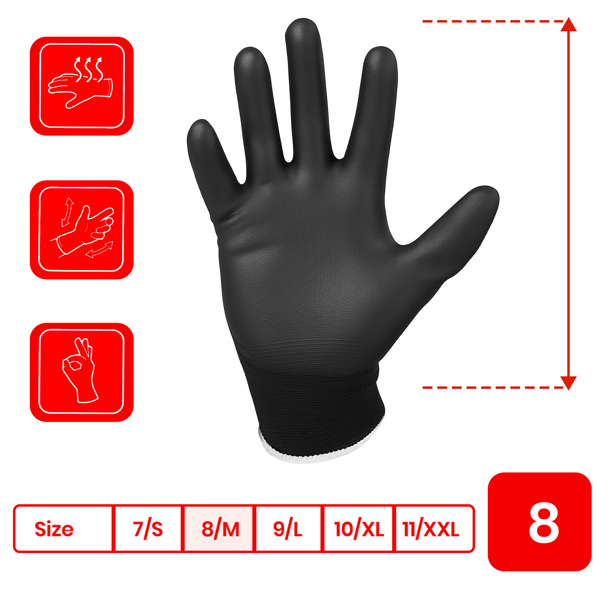 Dzięki temu dłonie pozostają suche, a użytkownik zachowuje pełną kontrolę nad pracą. Rękawice są lekkie i wygodne, co pozwala pracować przez dłuższy czas bez uczucia zmęczenia. Sprawdzają się na co dzień w warsztacie lub na budowie.