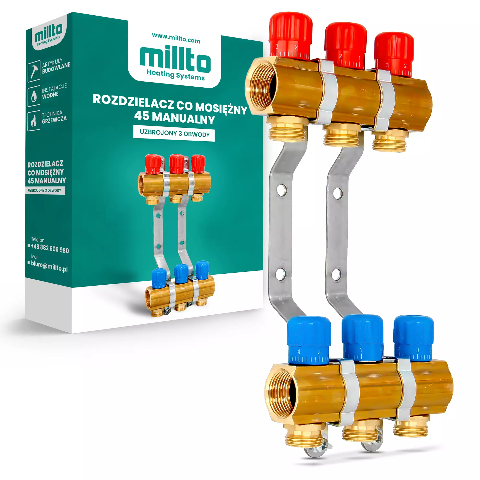 Rozdzielacz CO mosiężny 45 manualny - uzbrojony 3 obwody