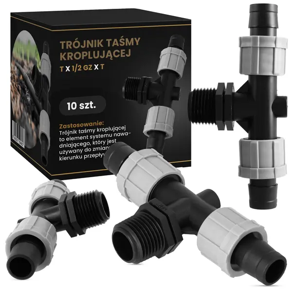 Element został zaprojektowany specjalnie do taśm kroplujących. To zapewnia dokładne dopasowanie, a uzyskane połączenie jest odporne na przeciekanie. Skręcane nakładki na gwincie zapobiegają wyślizgiwaniu się przewodów. Dzięki temu system działa bez zarzutu.