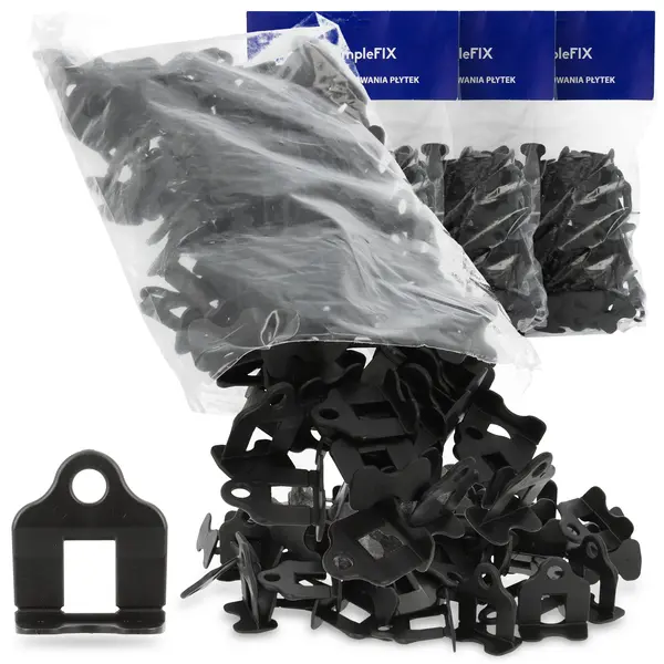 Klipsy do układania płytek wykonano z tworzywa sztucznego. Czarny kolor elementów sprawia, że można bardzo łatwo odróżnić je na tle większości kolorów płytek.
