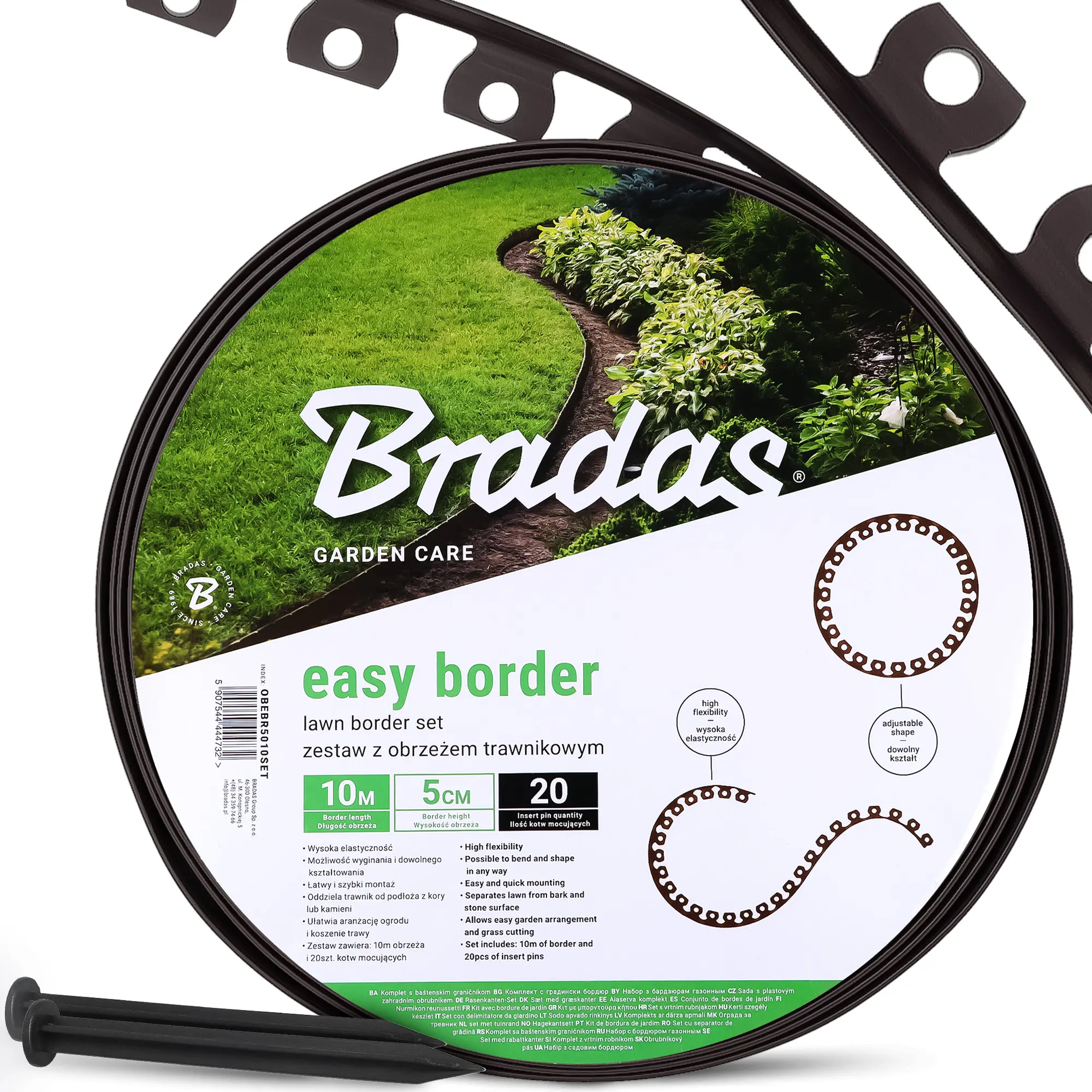 Elastyczne obrzeże trawnikowe z kotwami zapewnia pełną kontrolę nad wyglądem ogrodu, umożliwiając precyzyjne oddzielenie trawnika od kory, kamieni lub żwiru. Możliwość dowolnego kształtowania sprawia, że produkt idealnie sprawdza się przy rabatach, ścieżkach i nowoczesnych aranżacjach krajobrazu.
